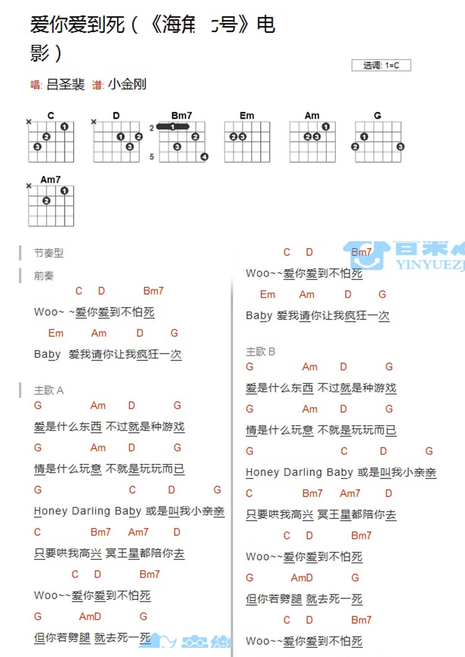 曲谱介绍: C调版海角七号《爱你爱到死》吉他和弦弹唱谱