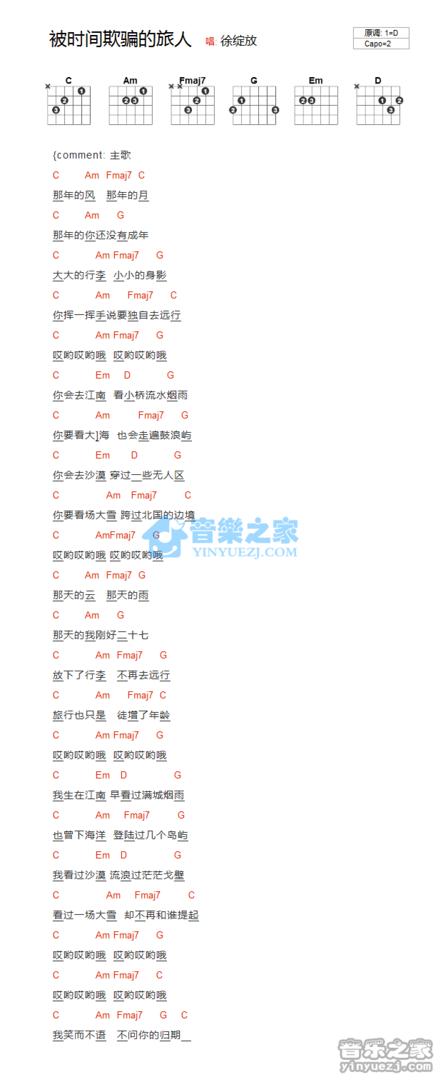 曲谱介绍: D调版《被时间欺骗的旅人》吉他和弦弹唱谱