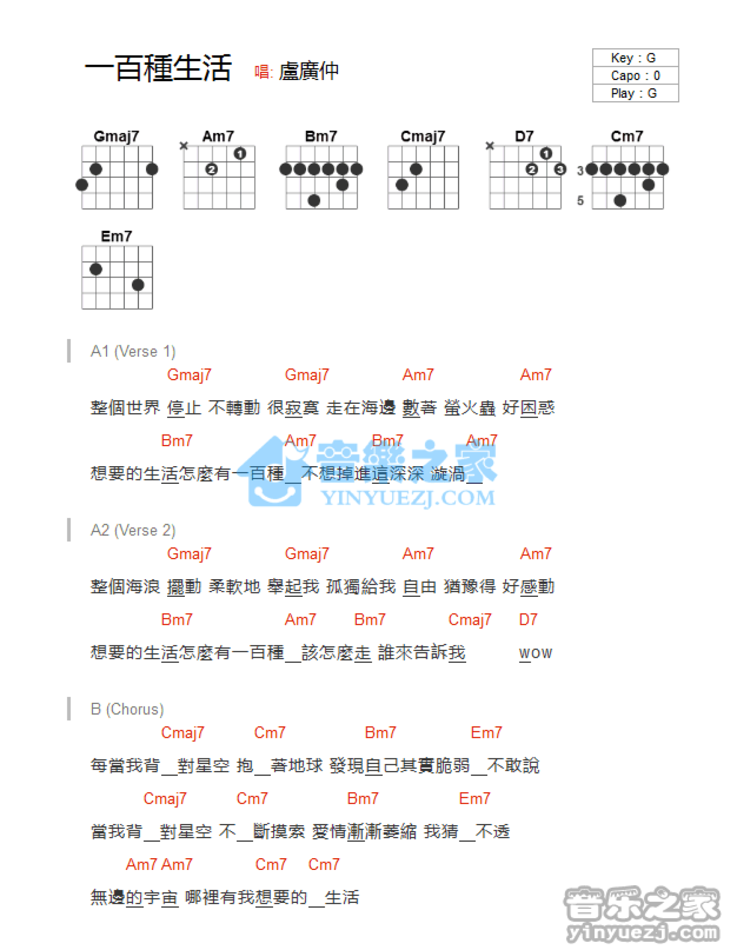 曲谱介绍: G调版卢广仲《一百种生活》吉他和弦弹唱谱