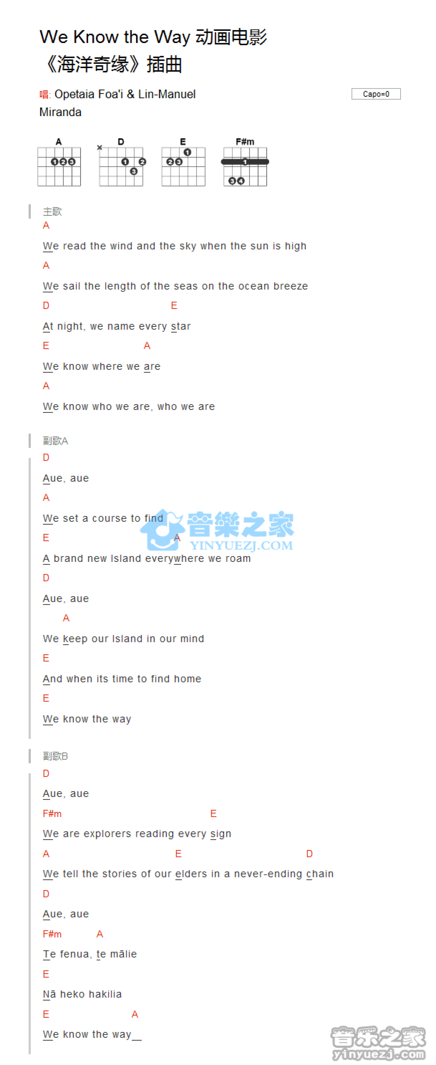 We Know The Way吉他谱 - 海洋奇缘插曲 - A调吉他弹唱谱 - 和弦谱