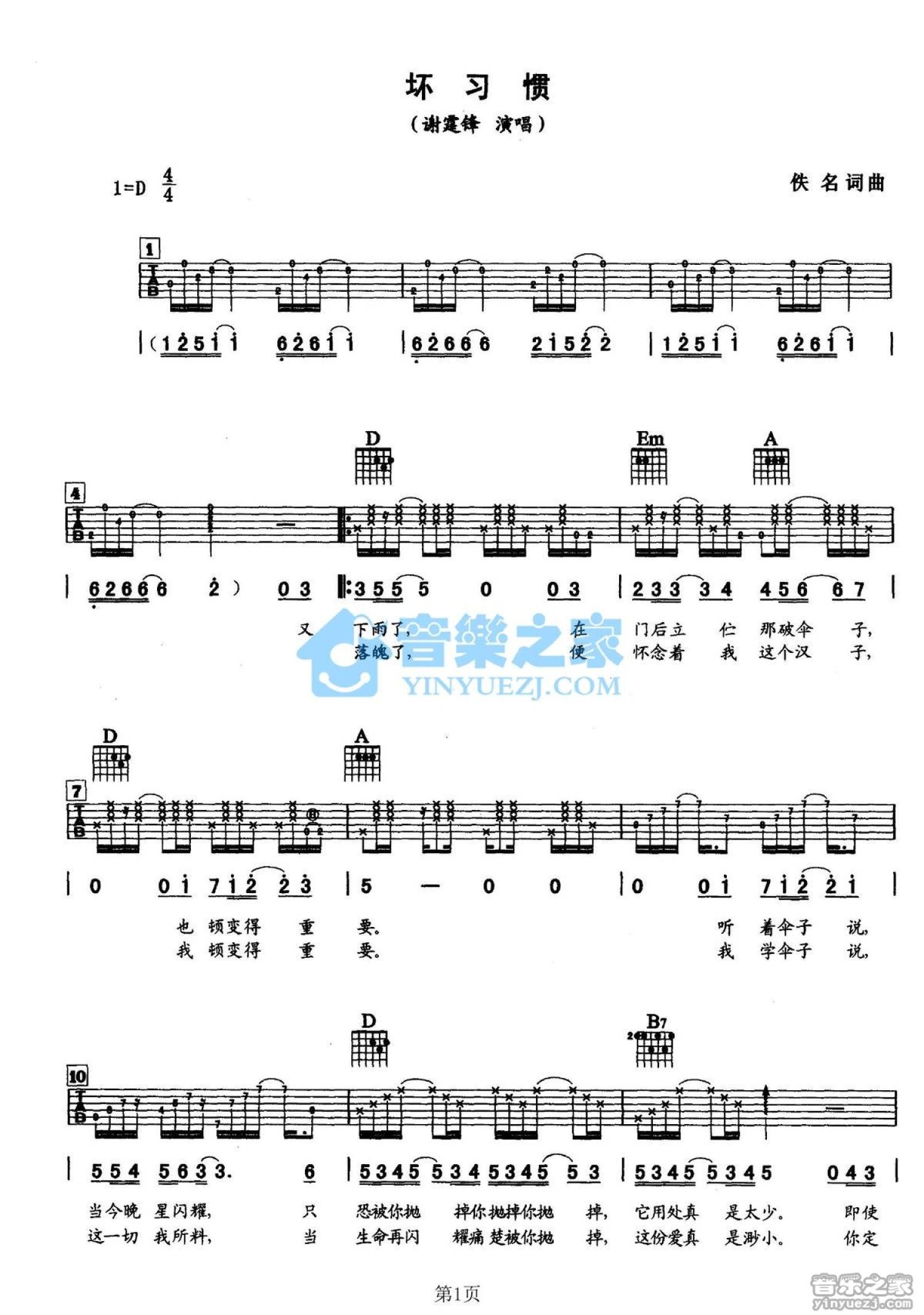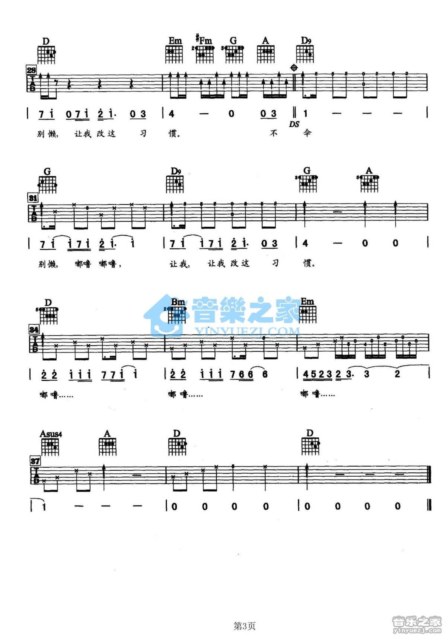 曲谱介绍: D调版《坏习惯》吉他弹唱六线谱