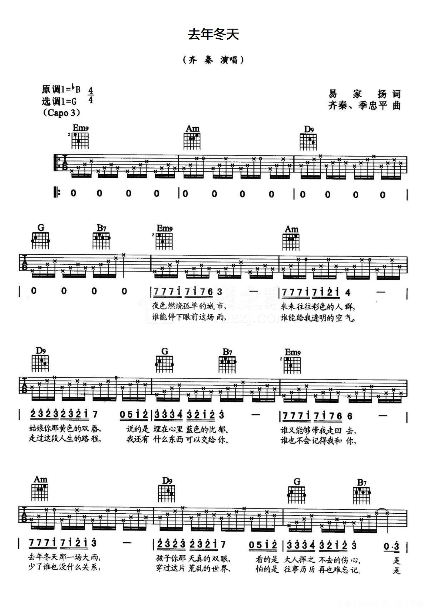 曲谱介绍: G调完整版齐秦《去年冬天》吉他弹唱六线谱