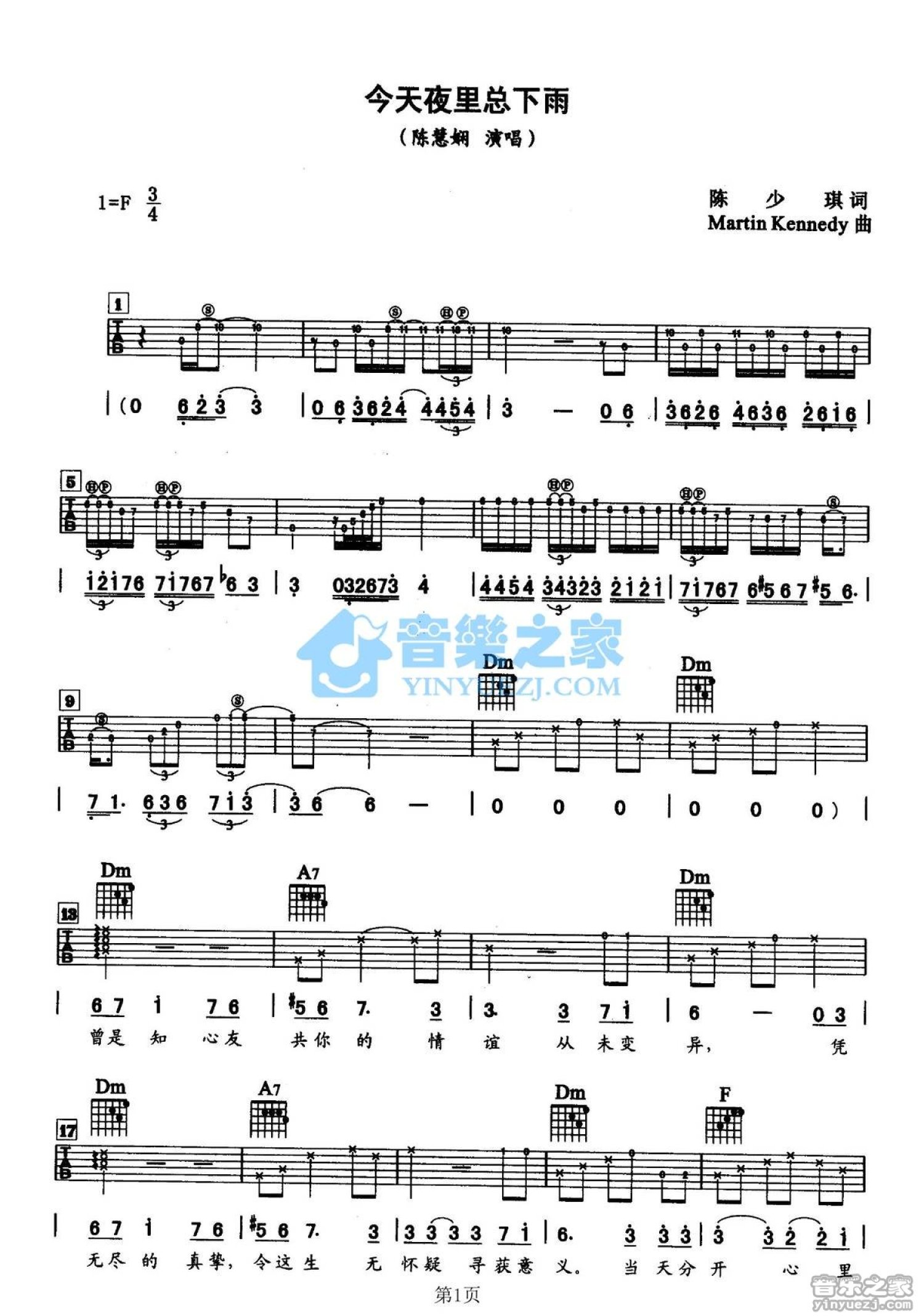 曲谱介绍: F调双吉他版陈慧娴《今天夜里总下雨》吉他弹唱六线谱