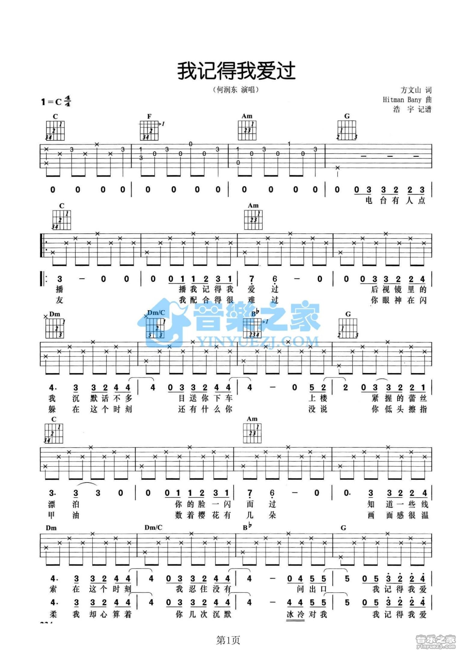 曲谱介绍: C调版《记得我爱过》吉他弹唱六线谱