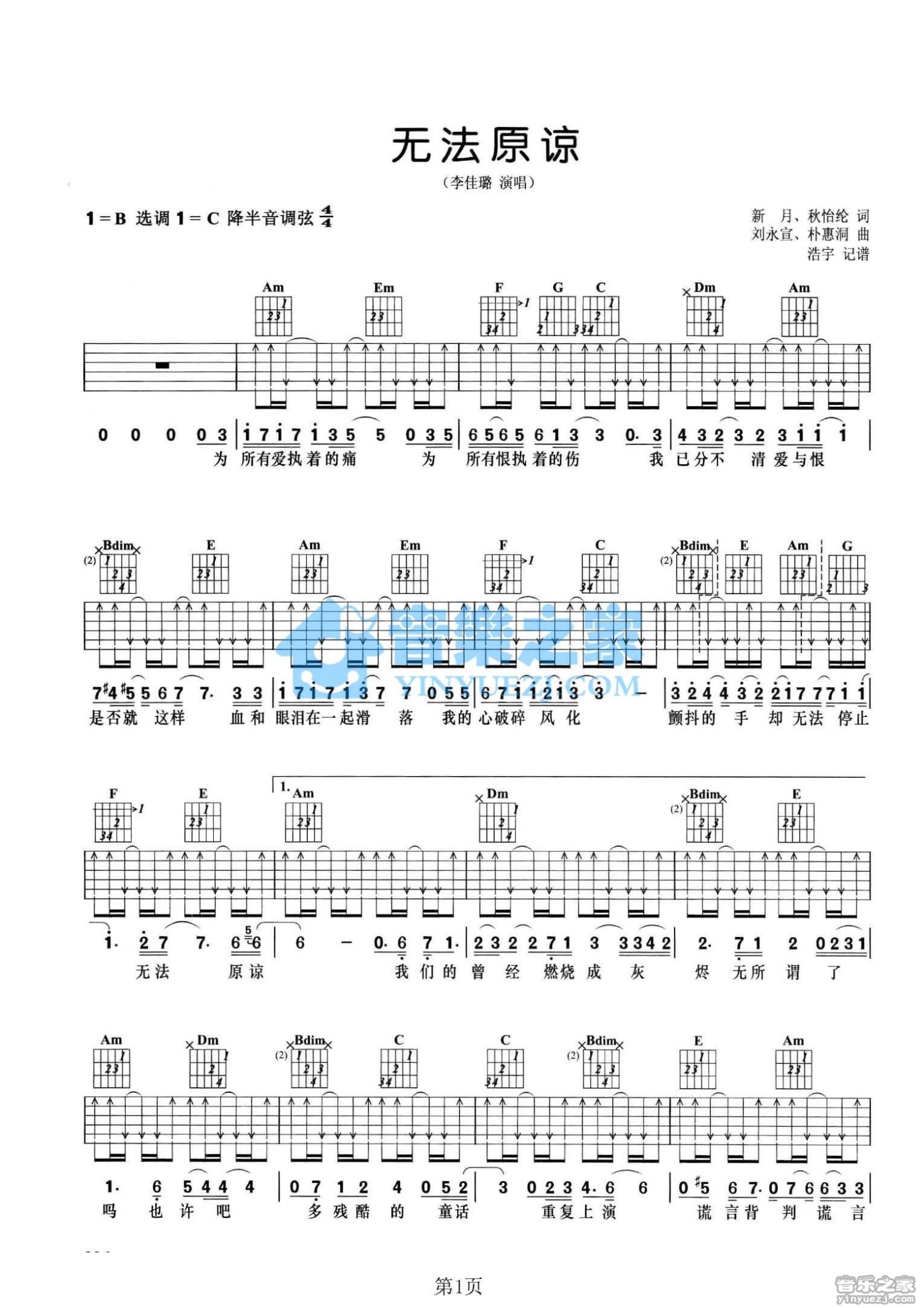 曲谱介绍: C调版《无法原谅》吉他弹唱六线谱