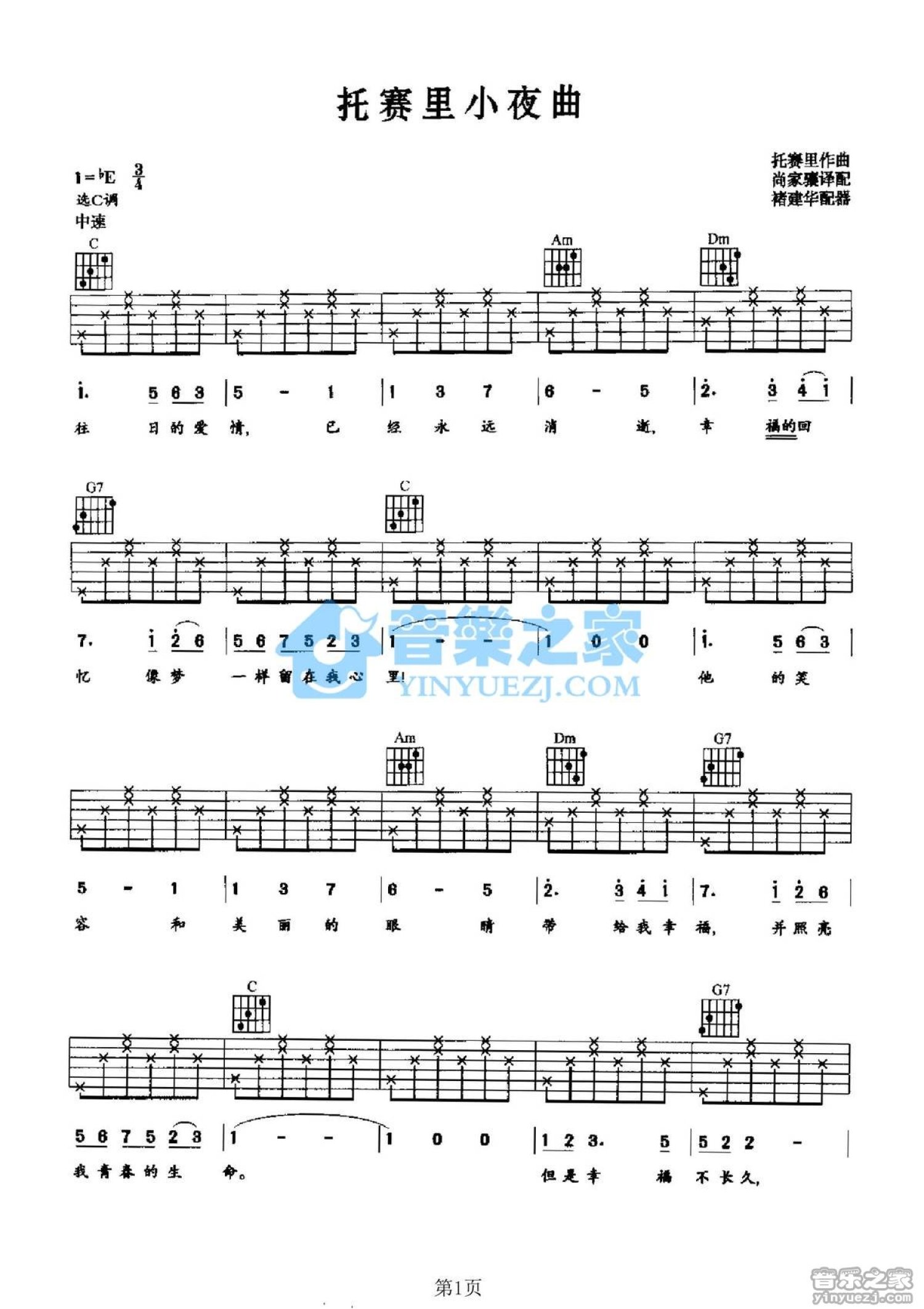 曲谱介绍: C调版托赛里《小夜曲》吉他弹唱六线谱