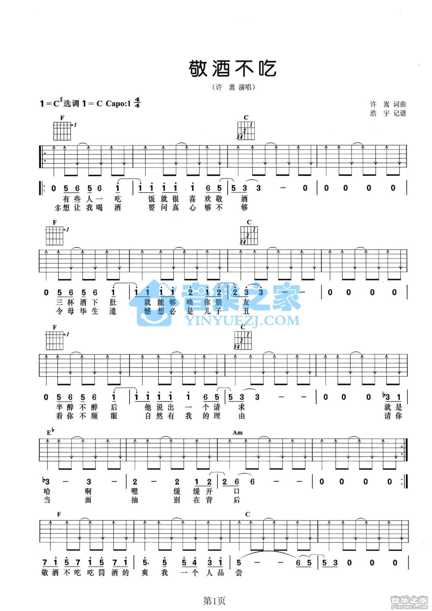 曲谱介绍: C调版许嵩《敬酒不吃》吉他弹唱六线谱