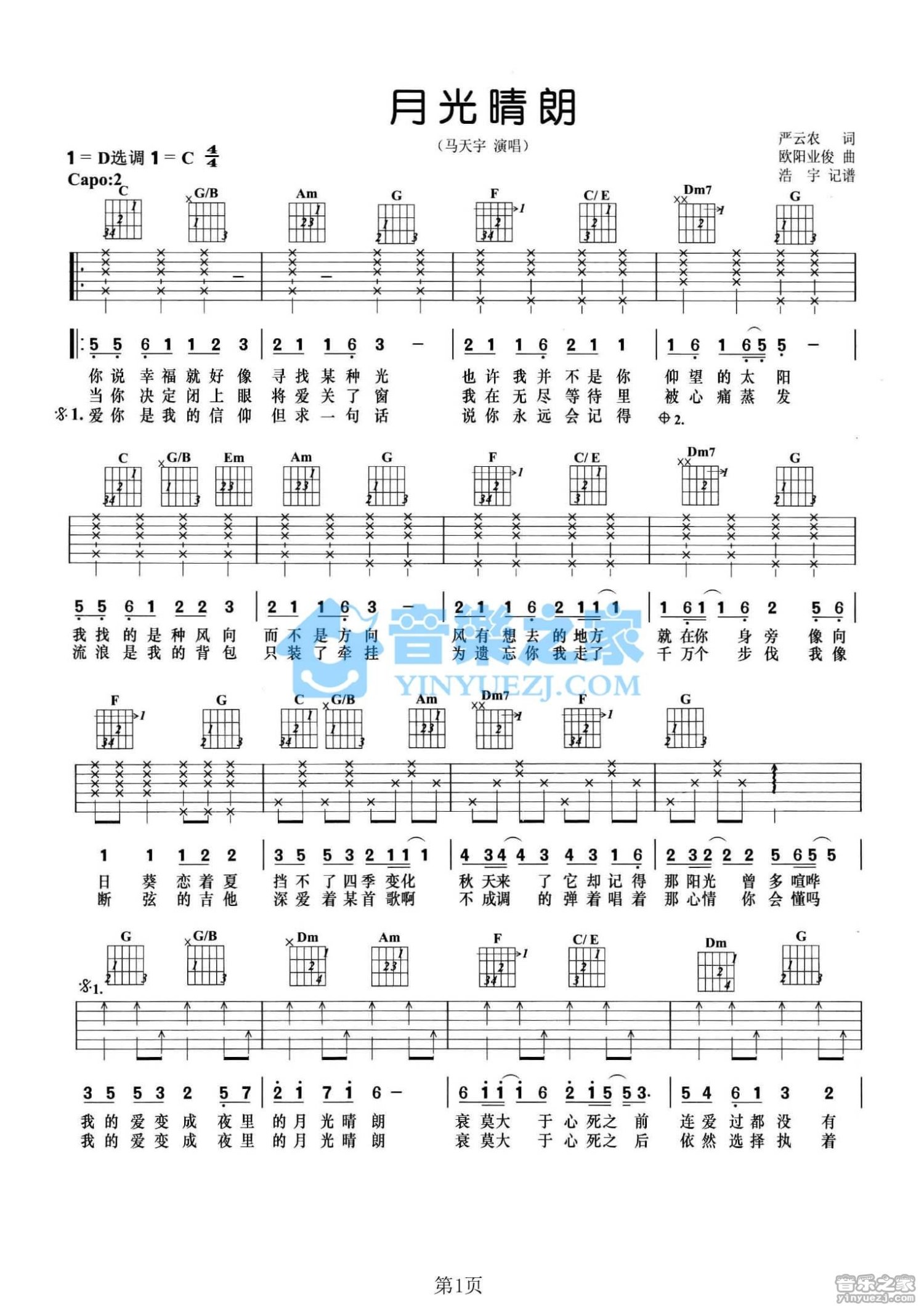 曲谱介绍: C调版马天宇《月光晴朗》吉他弹唱六线谱