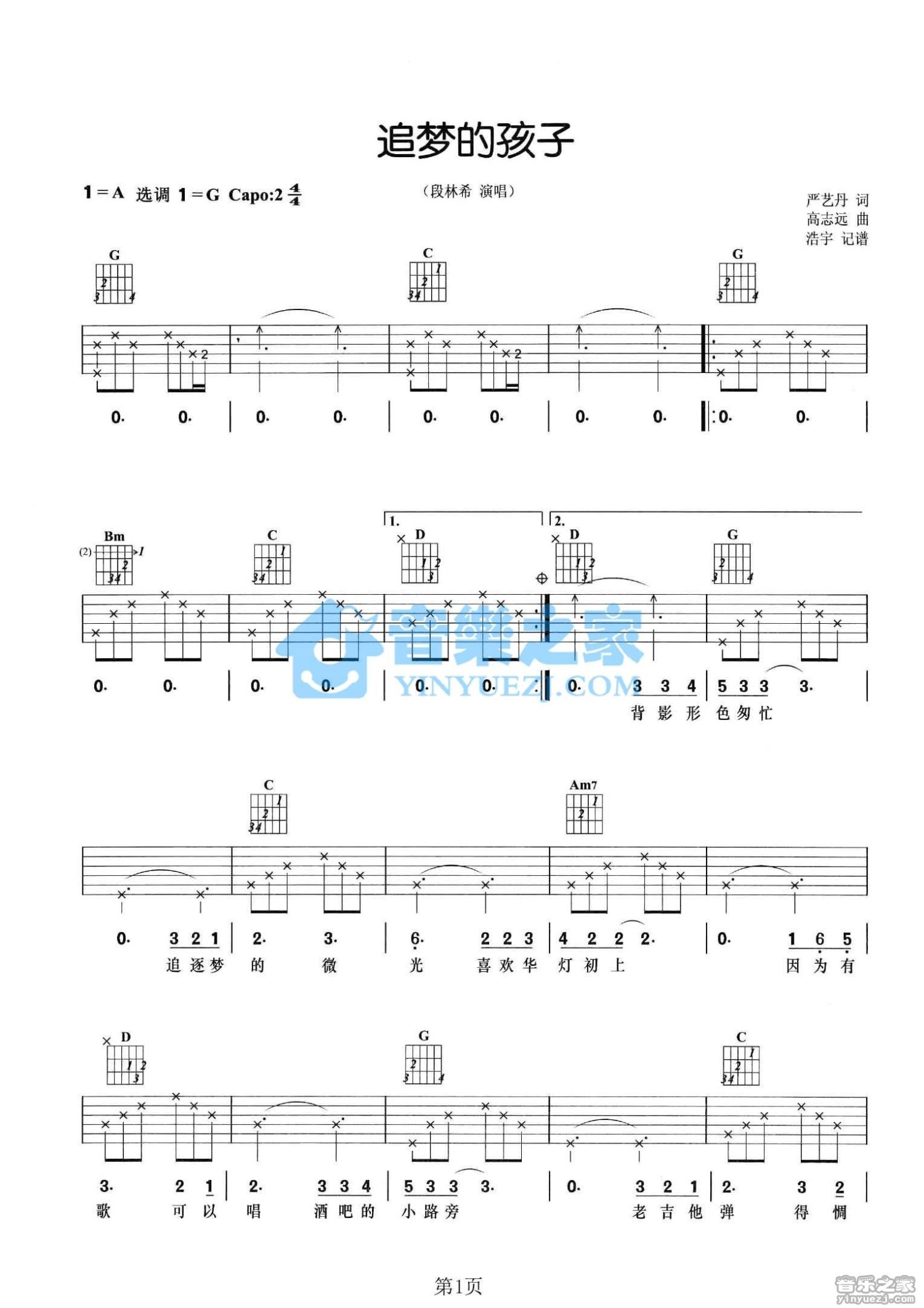 曲谱介绍: G调版段林希《追梦的孩子》吉他弹唱六线谱