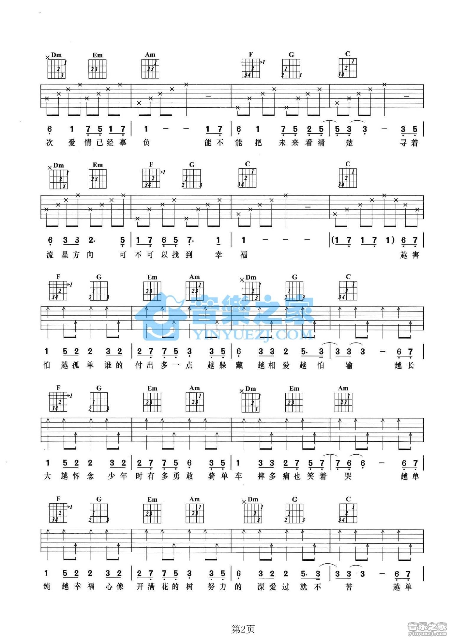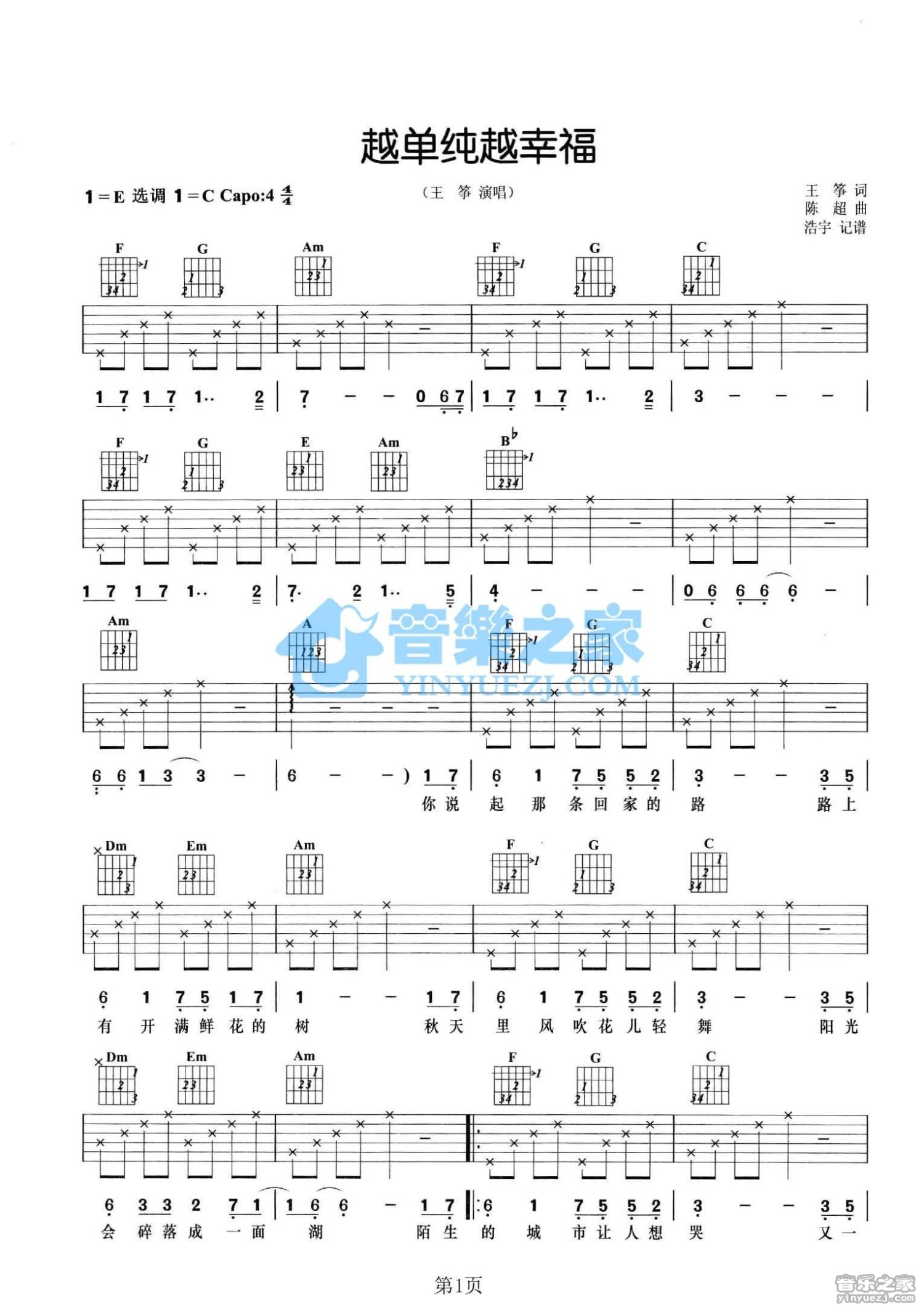 曲谱介绍: C调版王筝《越单纯越幸福》吉他弹唱六线谱