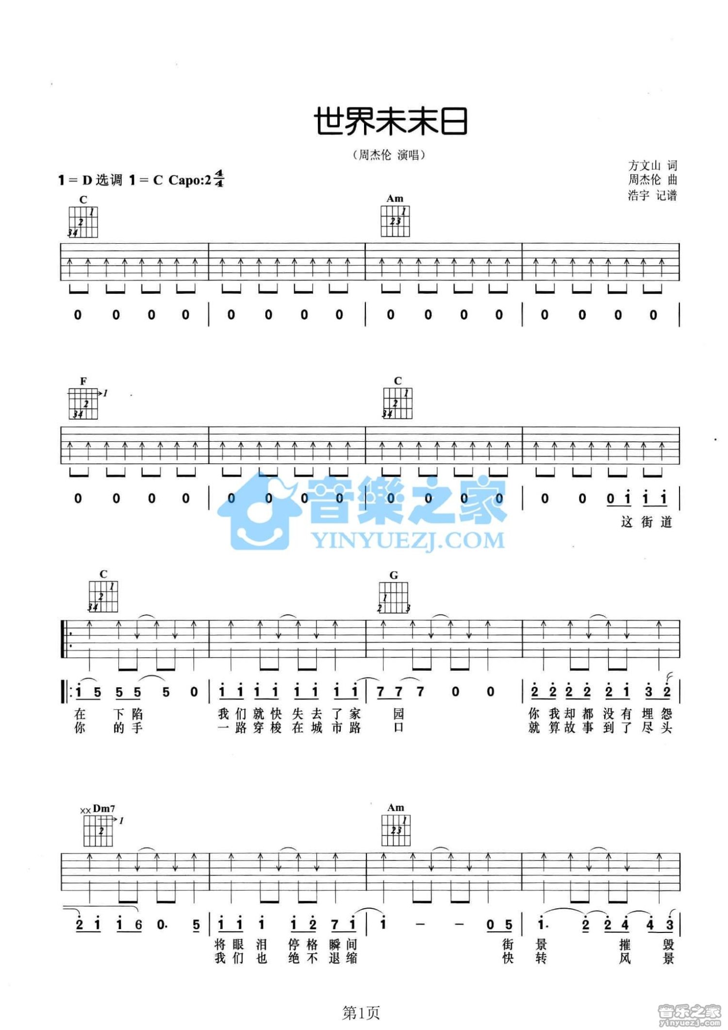 曲谱介绍: C调版周杰伦《世界未末日》吉他弹唱六线谱