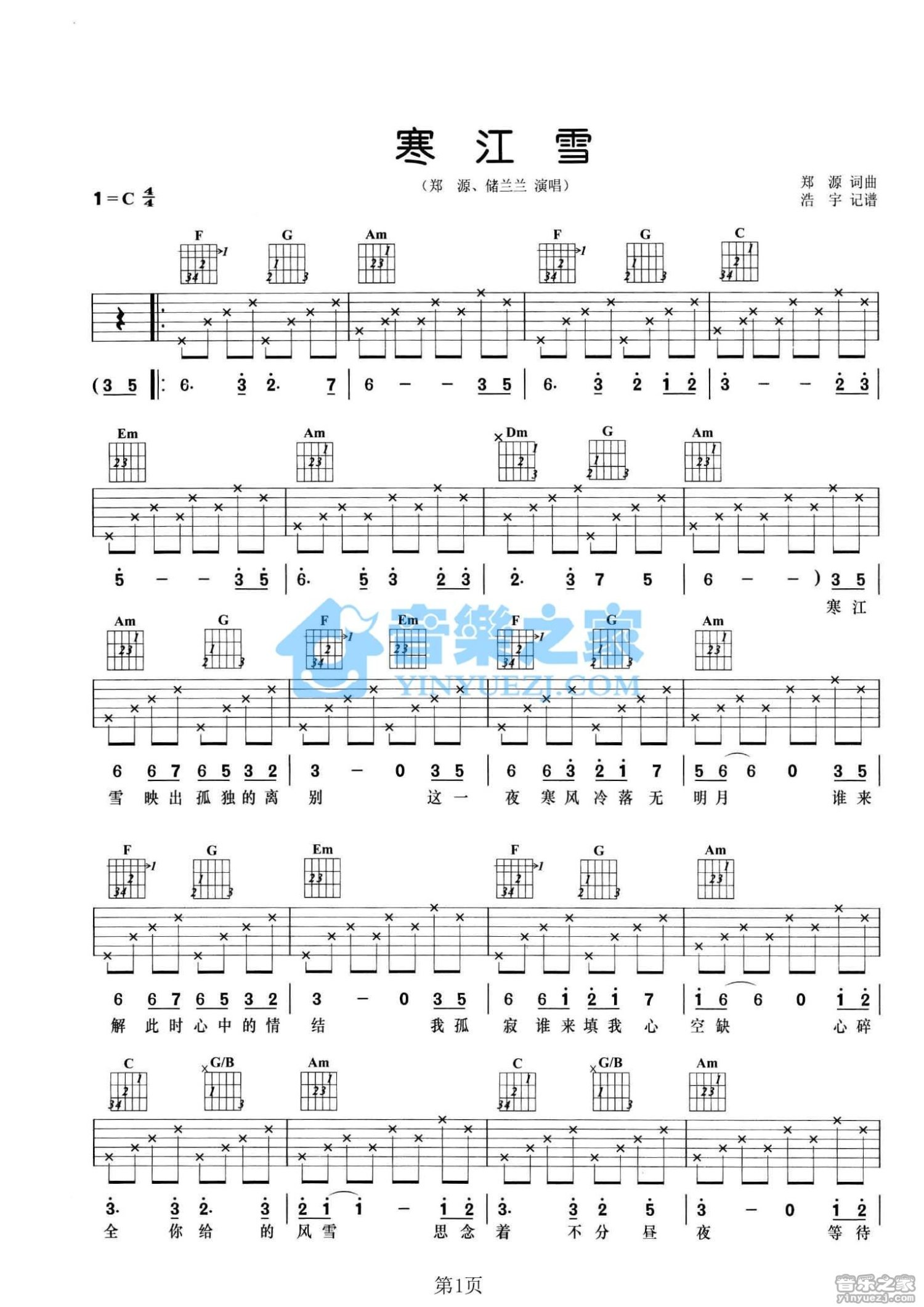 寒江雪吉他谱 - 郑源/储兰兰 - C调吉他弹唱谱