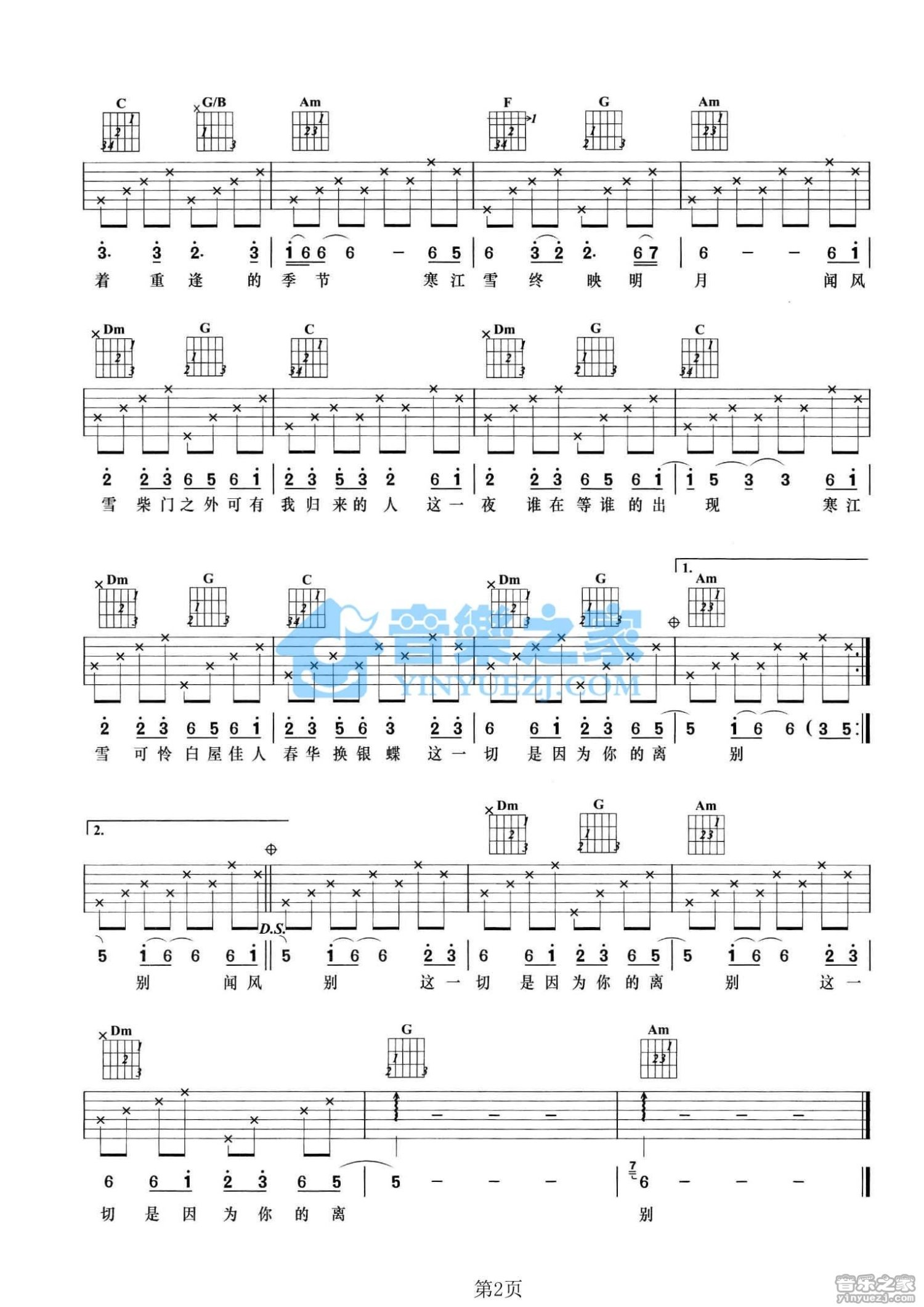 曲谱介绍: C调版郑源/储兰兰《寒江雪》吉他弹唱六线谱