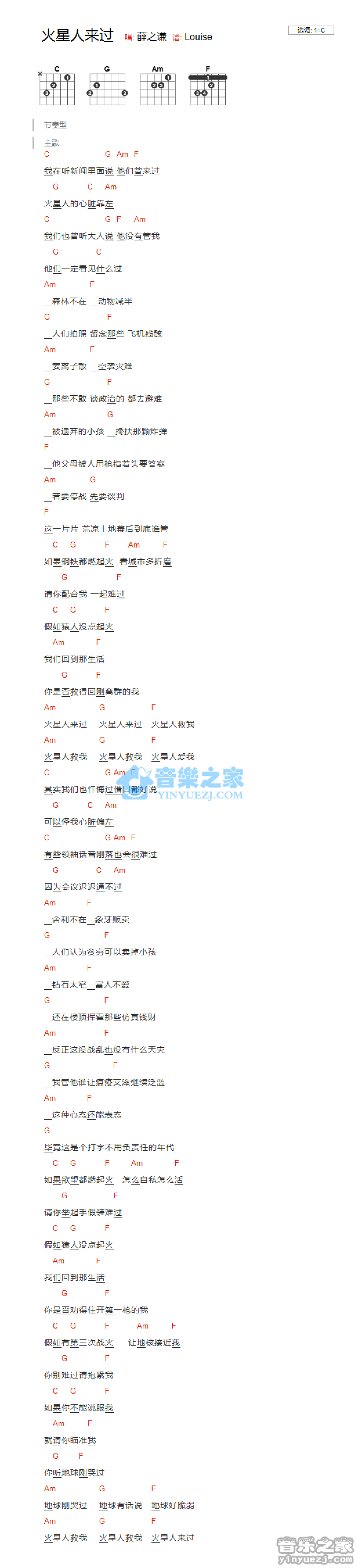 曲谱介绍: C调版薛之谦《火星人来过》吉他和弦弹唱谱