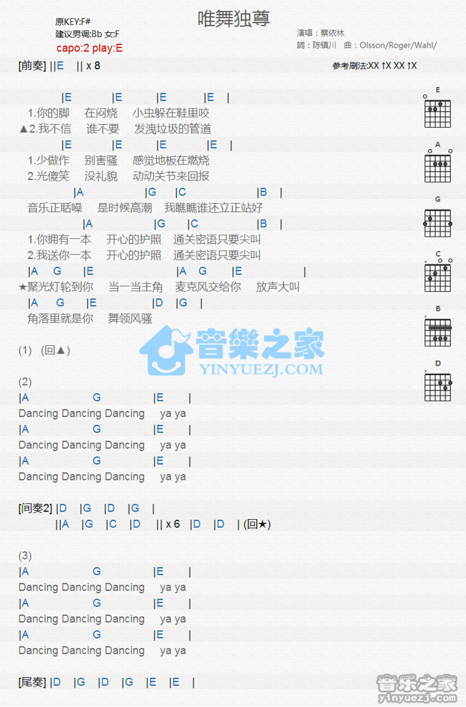 曲谱介绍: E调版蔡依林《唯舞独尊》吉他和弦弹唱谱