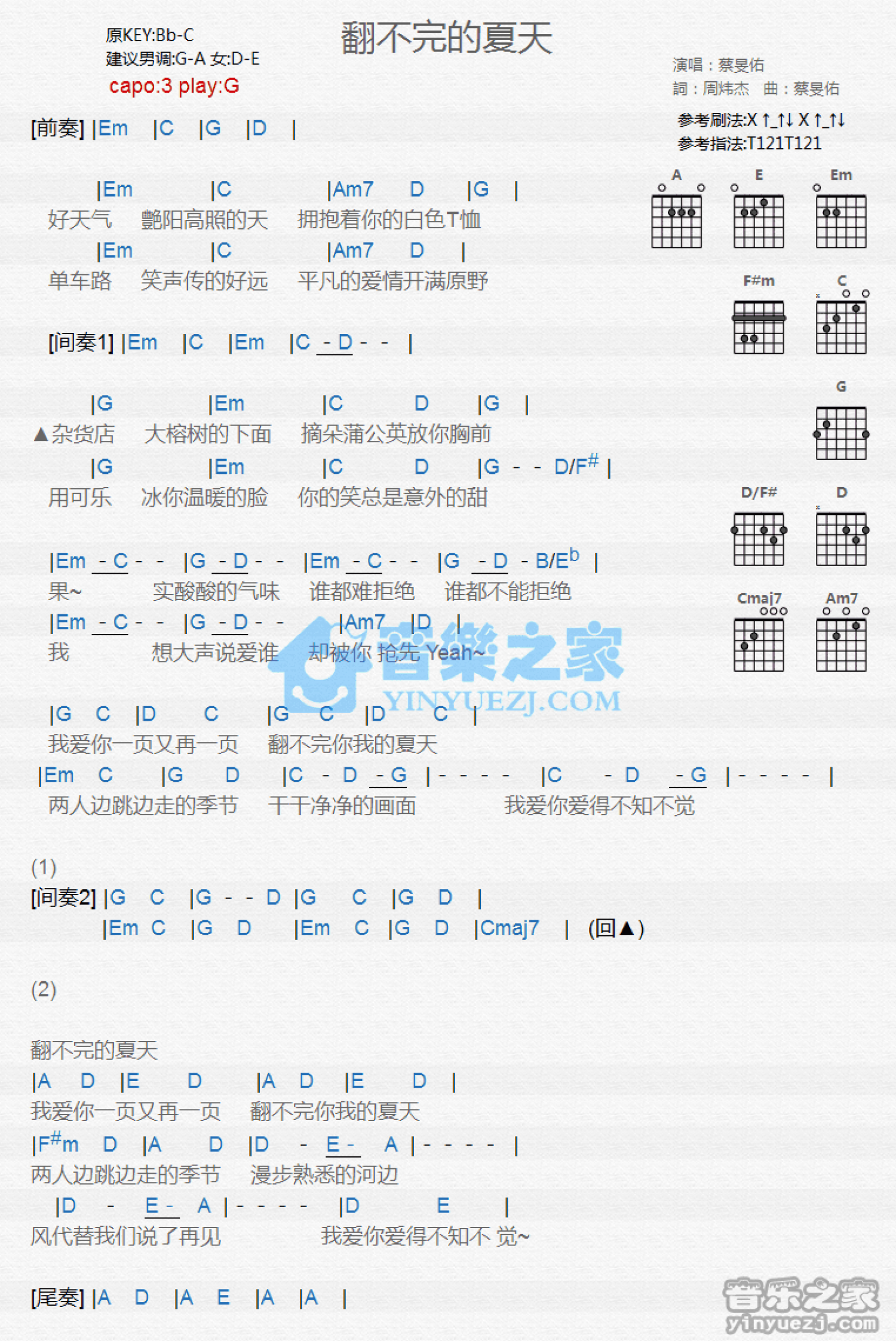曲谱介绍: G调版蔡旻佑《翻不完的夏天》吉他和弦弹唱谱