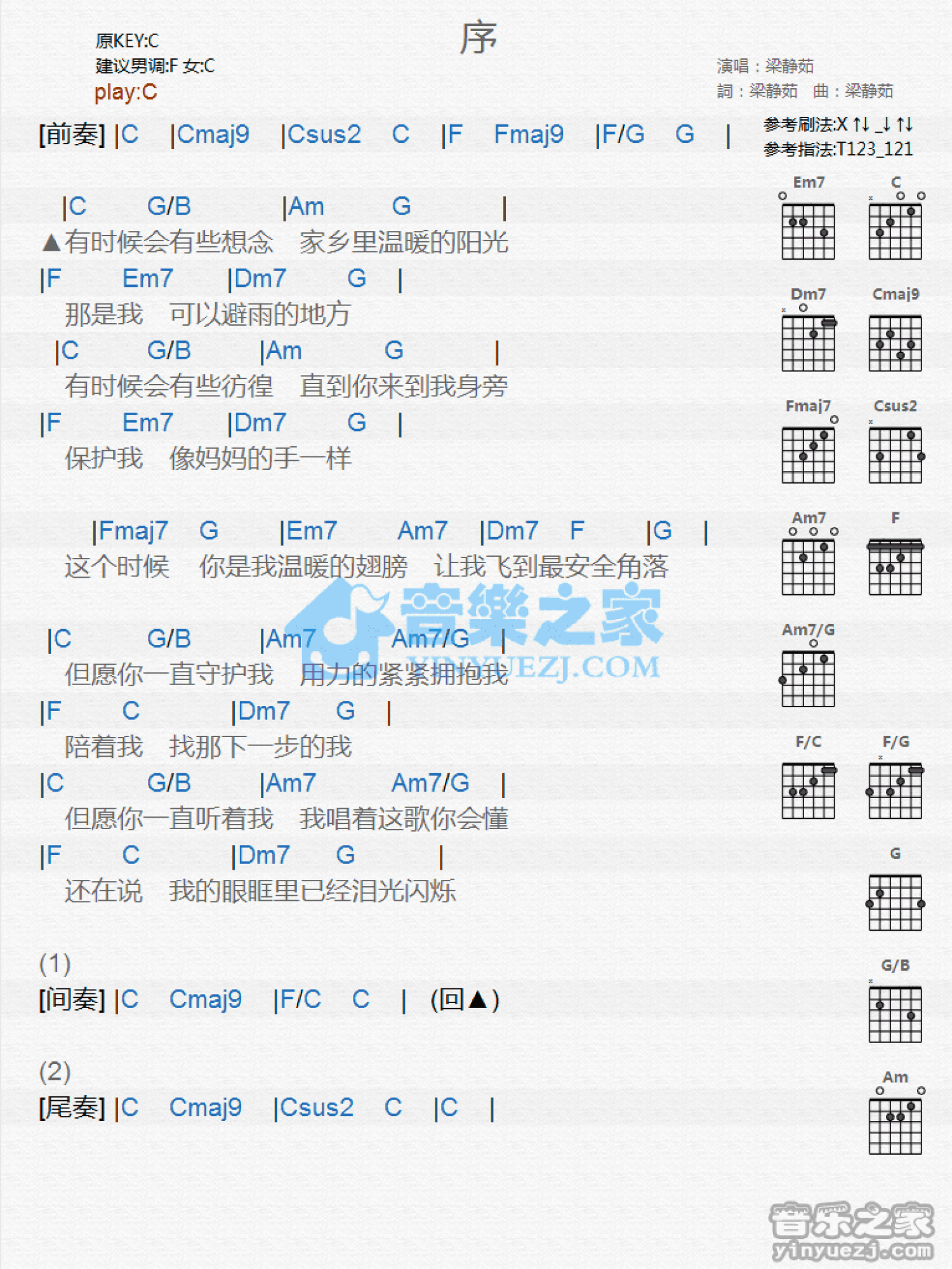 曲谱介绍: C调版梁静茹《序》吉他和弦弹唱谱