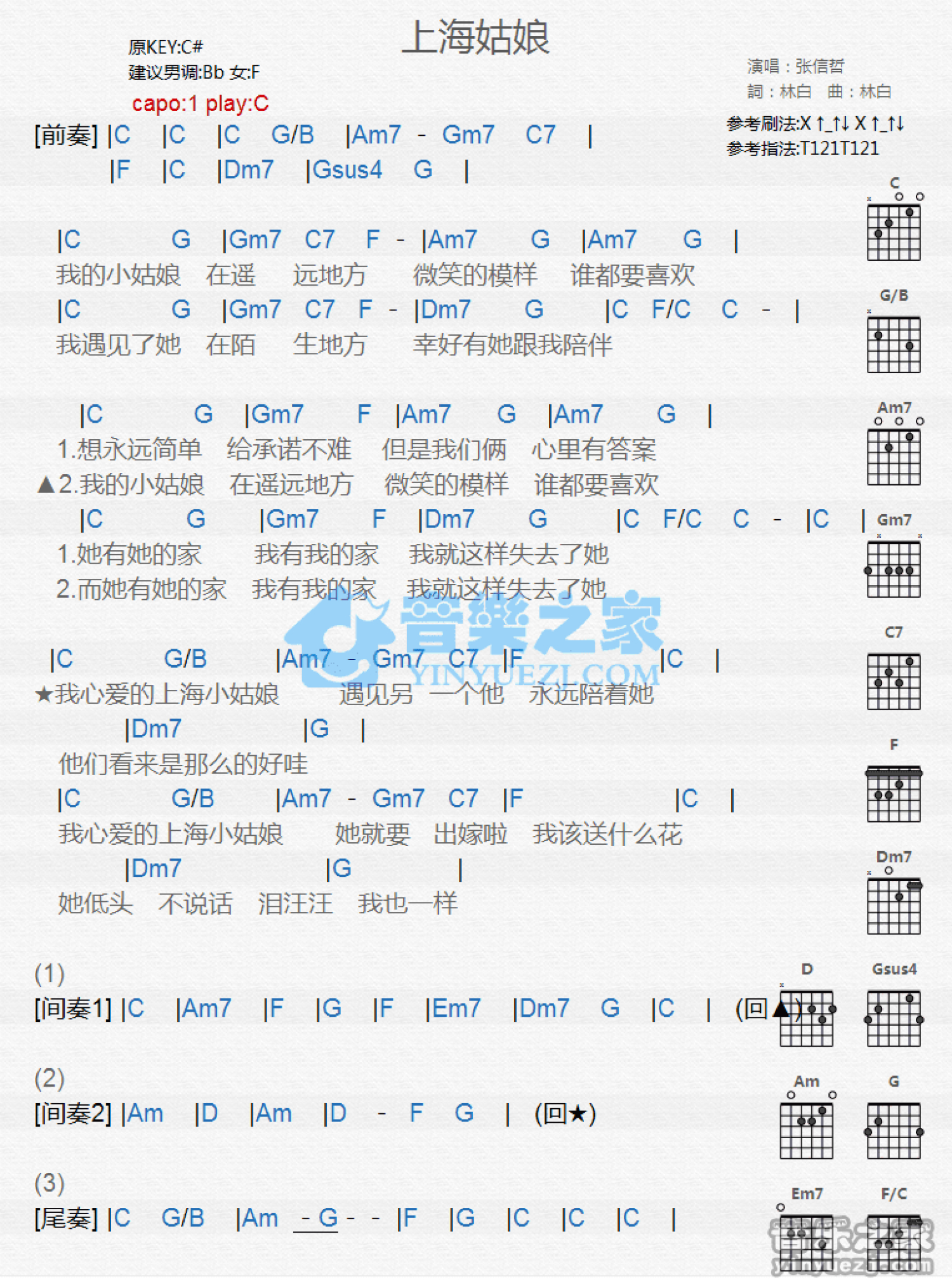 曲谱介绍: C调版张信哲《上海姑娘》吉他和弦弹唱谱
