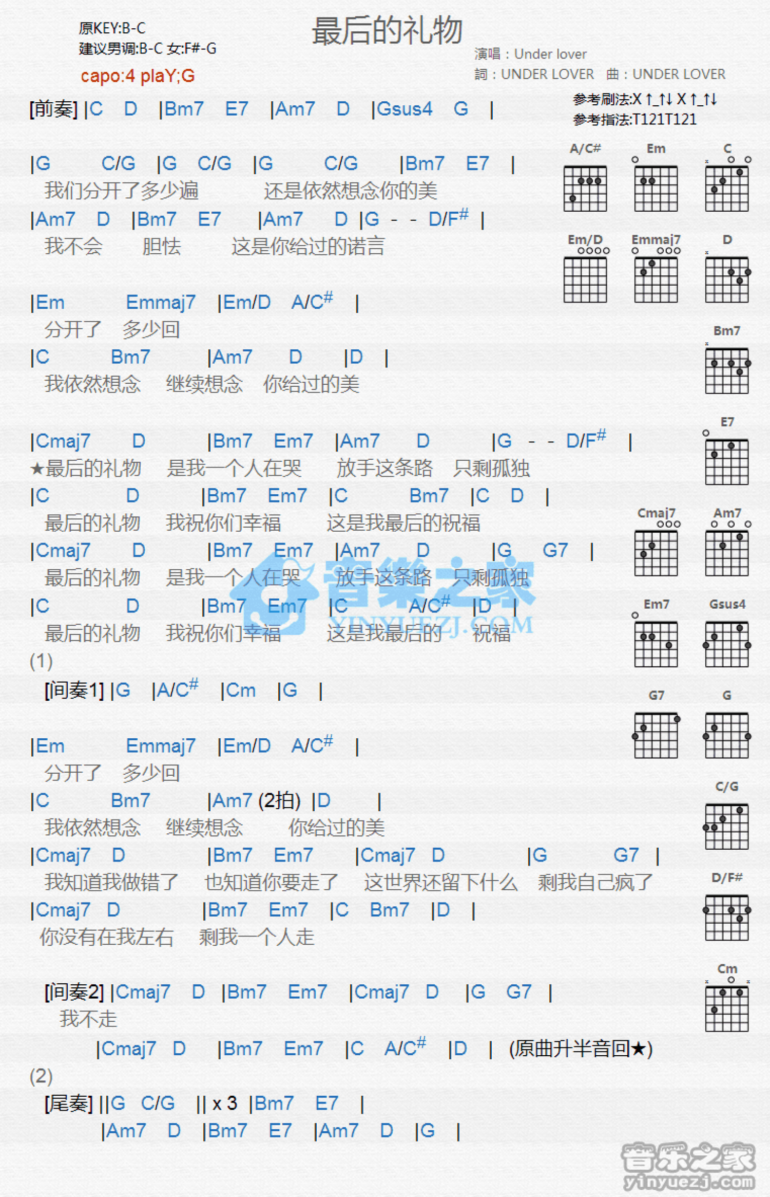曲谱介绍: G调版 Under Lover《最后的礼物》吉他和弦弹唱谱