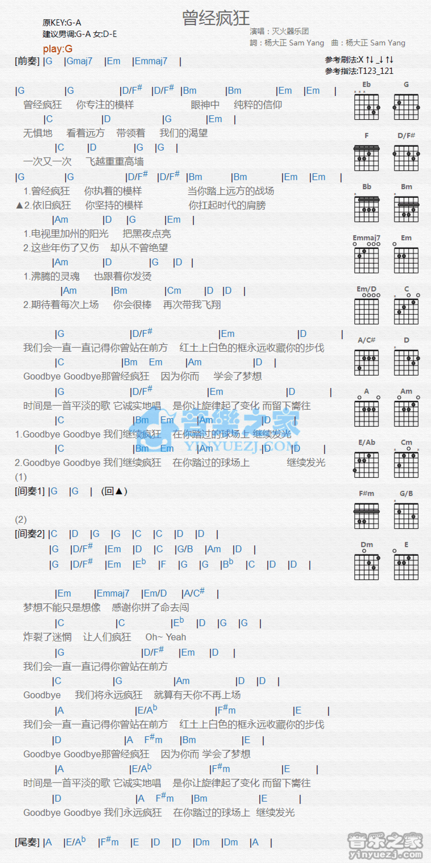 曲谱介绍: G调版灭火器《曾经疯狂》吉他和弦弹唱谱