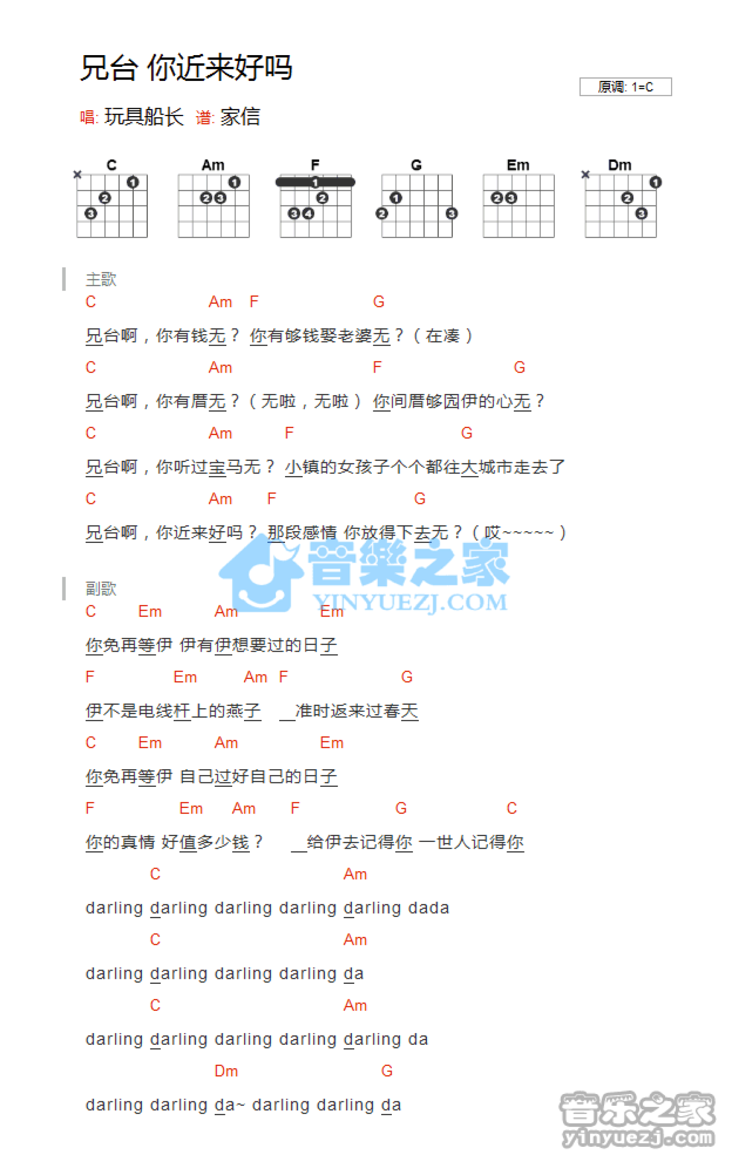 曲谱介绍: C调版玩具船长《兄台你近来好吗》吉他和弦弹唱谱