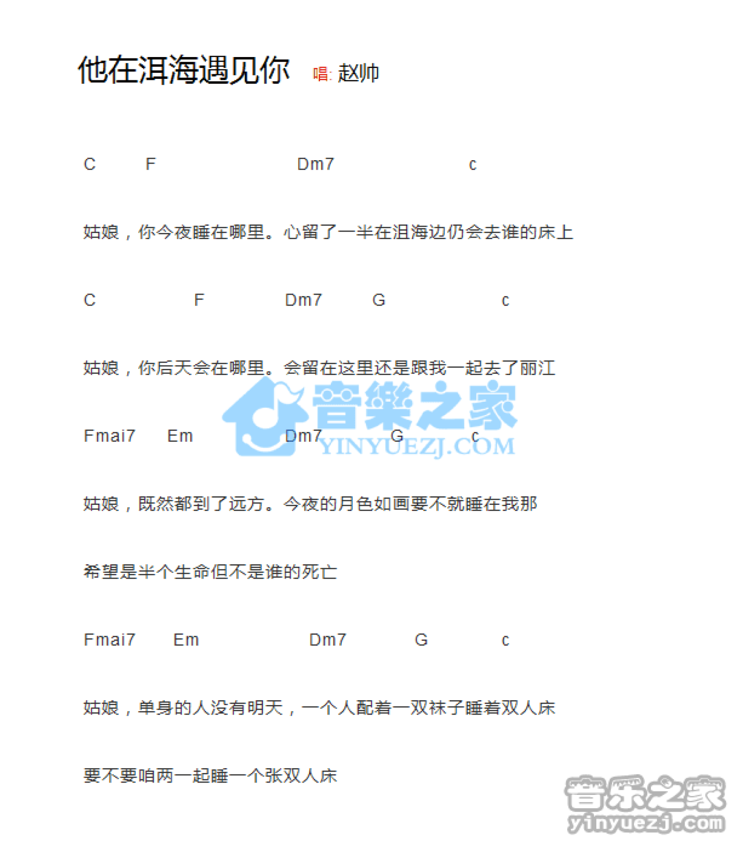 曲谱介绍: 赵帅《他在洱海遇见你》吉他和弦弹唱谱
