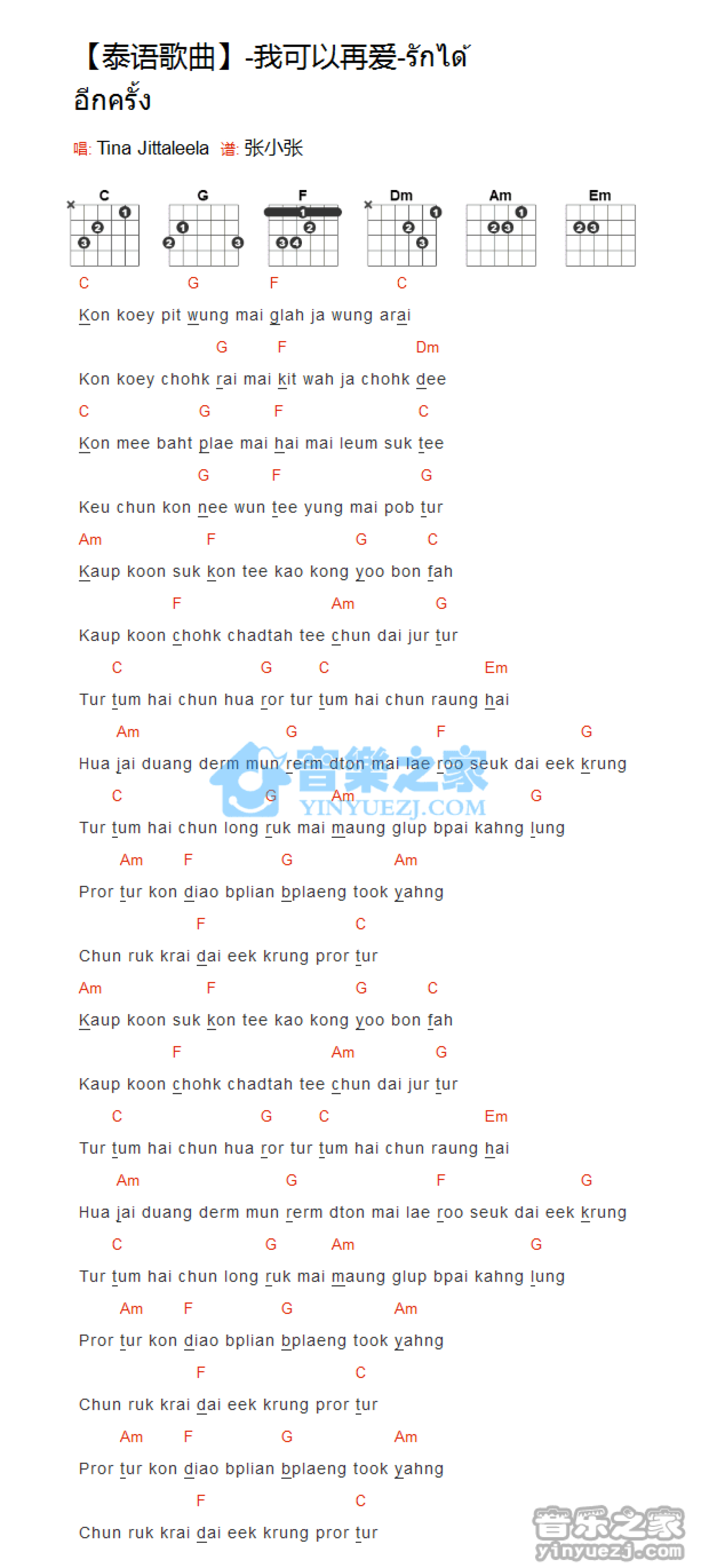 曲谱介绍: 泰语歌曲《我可以再爱》吉他和弦弹唱谱