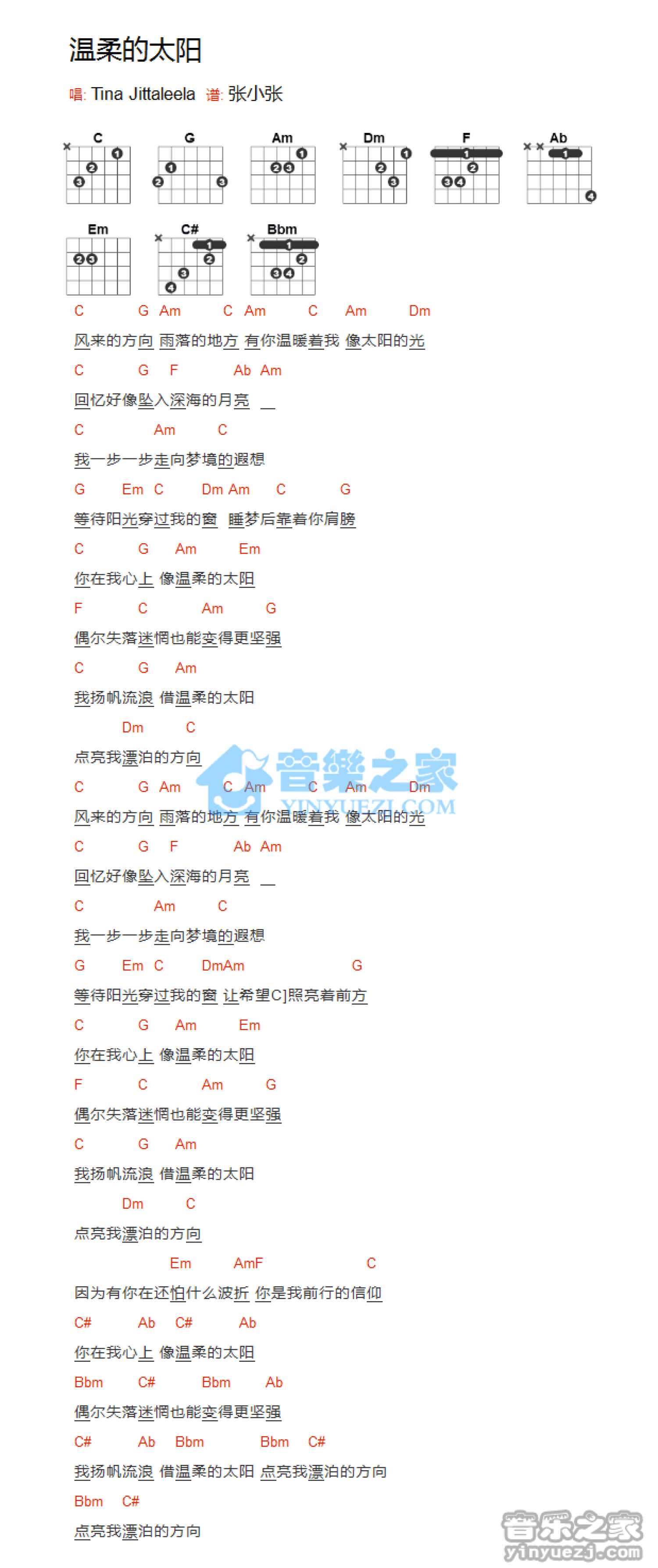 曲谱介绍: 李缇娜《温柔的太阳》吉他和弦弹唱谱