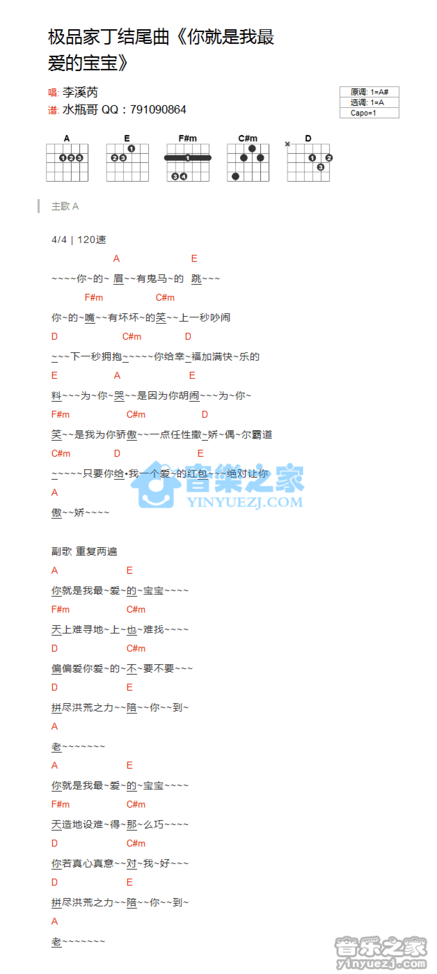 曲谱介绍: A调版极品家丁结尾曲《你就是我最爱的宝宝》吉他和弦弹唱谱