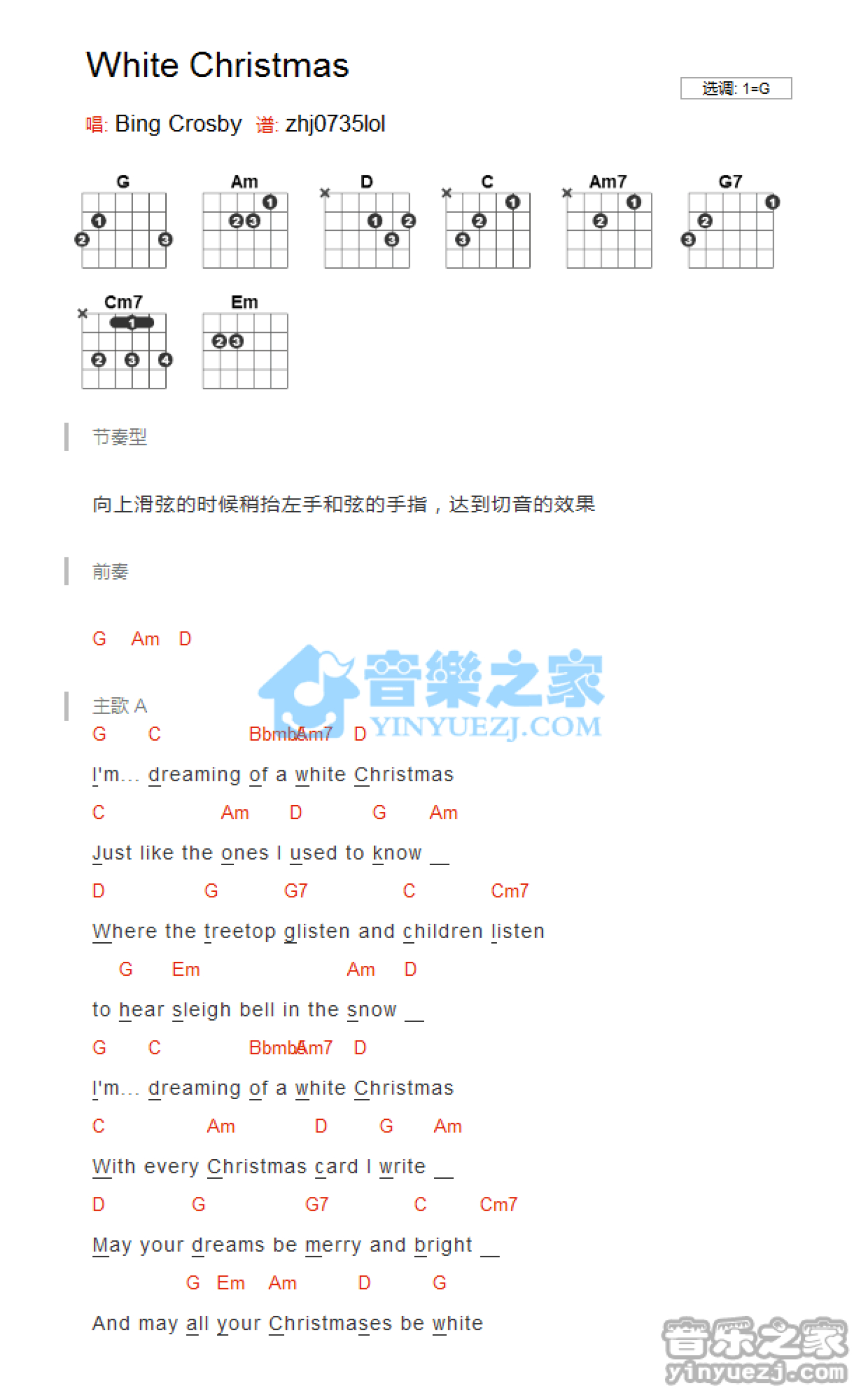 曲谱介绍: G调版BingCrosby《WhiteChristmas》吉他和弦弹唱谱