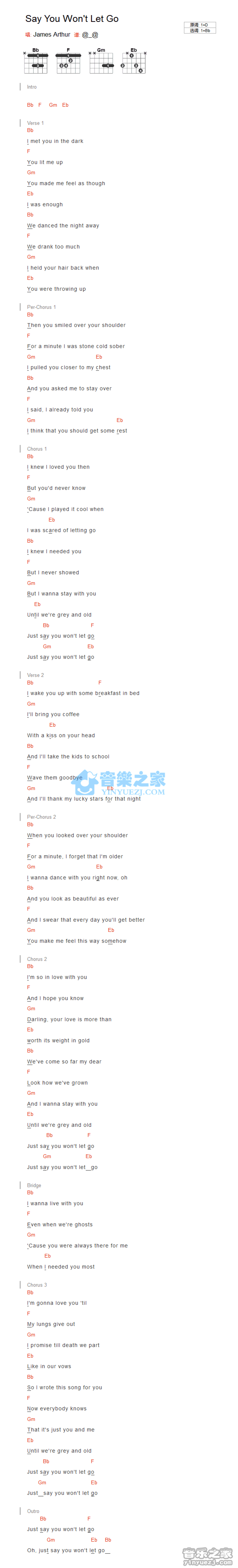 曲谱介绍: bB调版JamesArthur《SayYouWon'tLetGo》吉他和弦弹唱谱