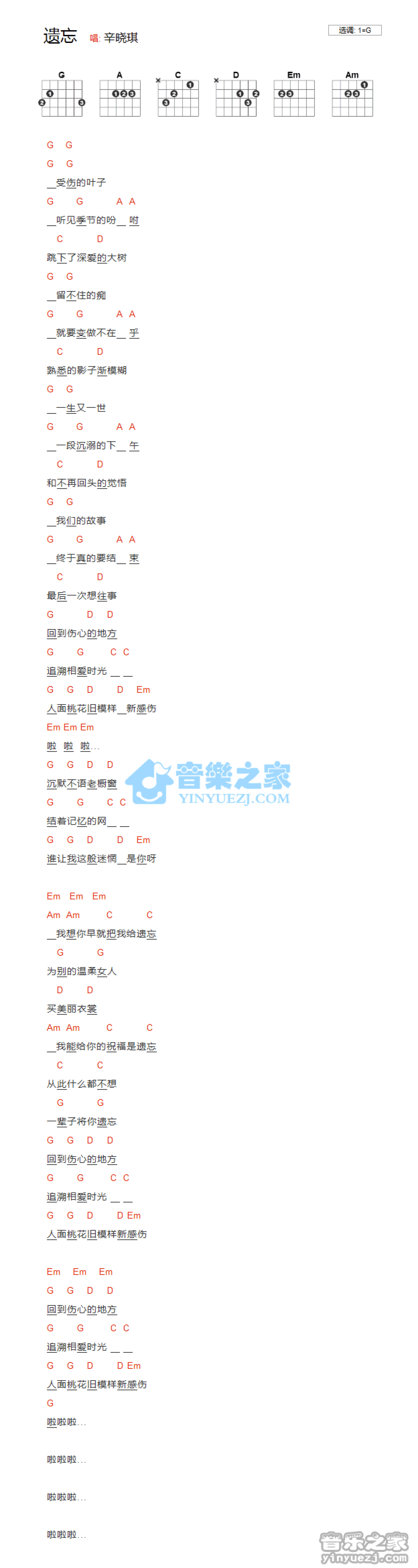 曲谱介绍: G调版辛晓琪《遗忘》吉他和弦弹唱谱
