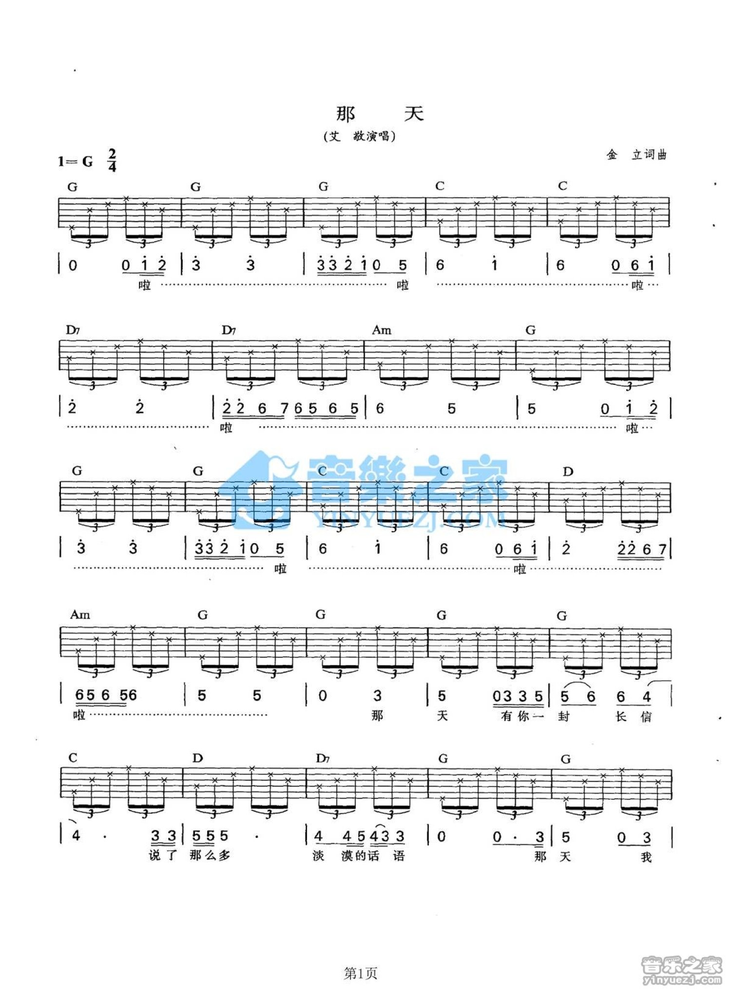 曲谱介绍: G调版艾敬《那天》吉他弹唱六线谱