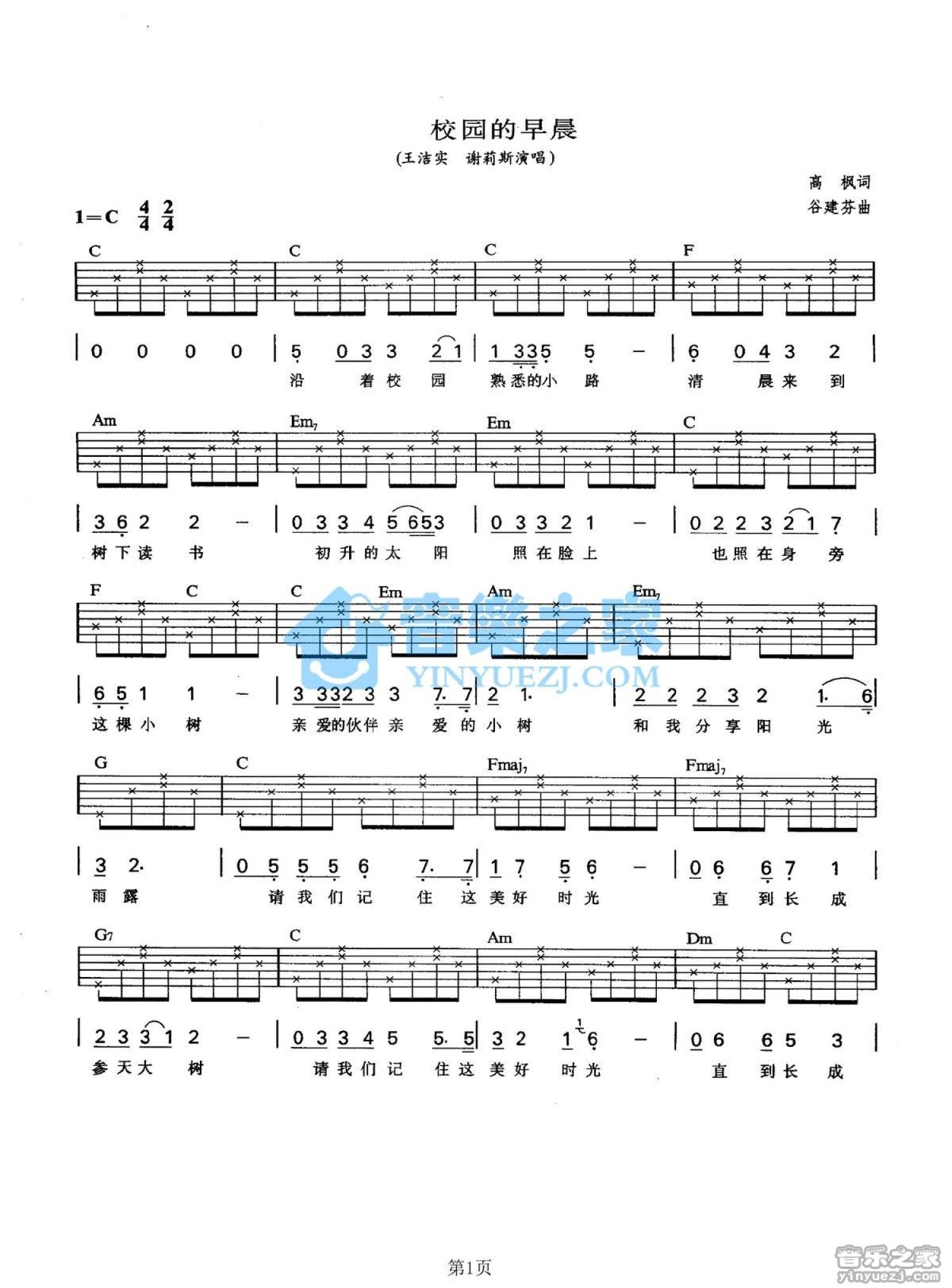 曲谱介绍: C调版王洁实/谢莉斯《校园的早晨》吉他弹唱六线谱