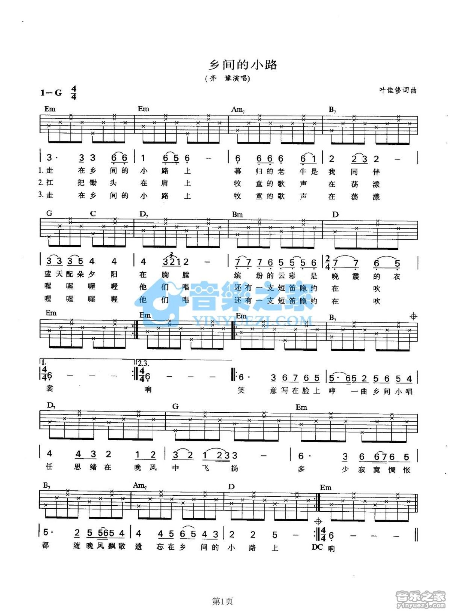 曲谱介绍: G调版《相间的小路》吉他弹唱六线谱
