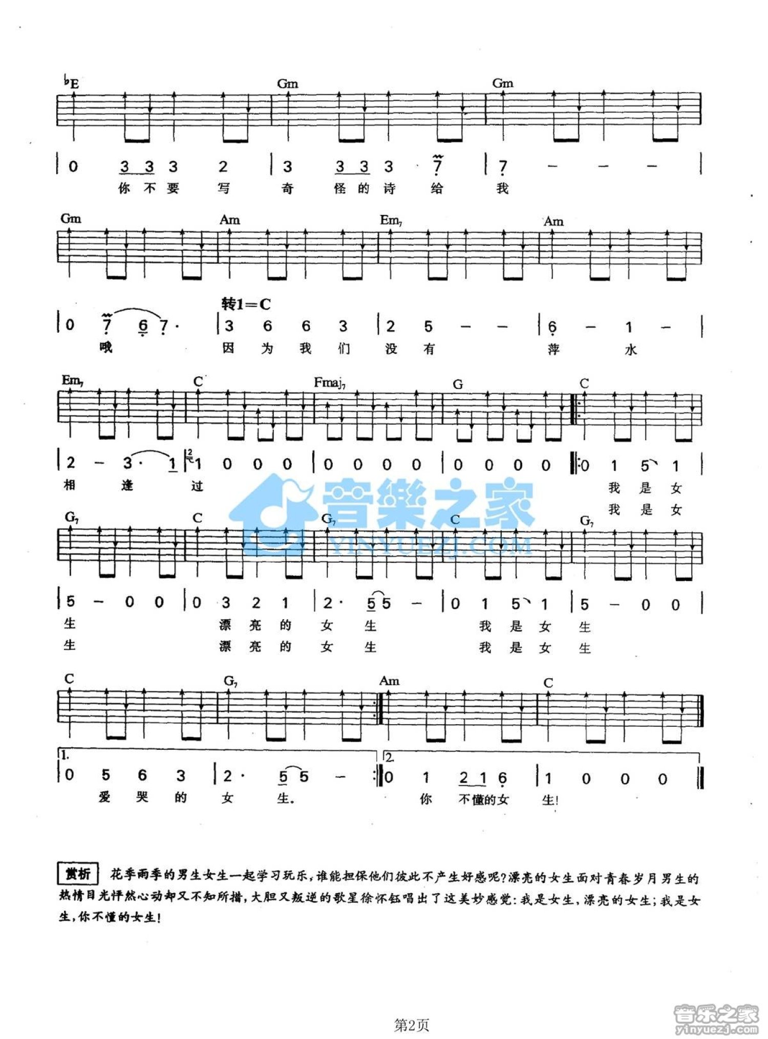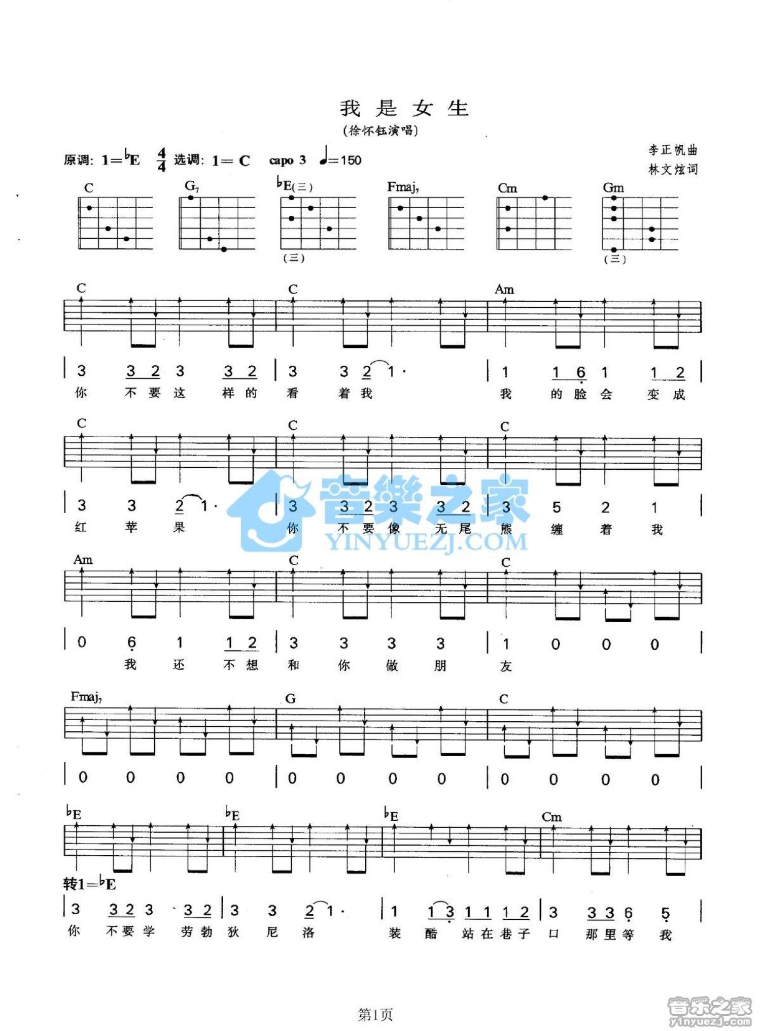 曲谱介绍: C调版徐怀钰《我是女生》吉他弹唱六线谱