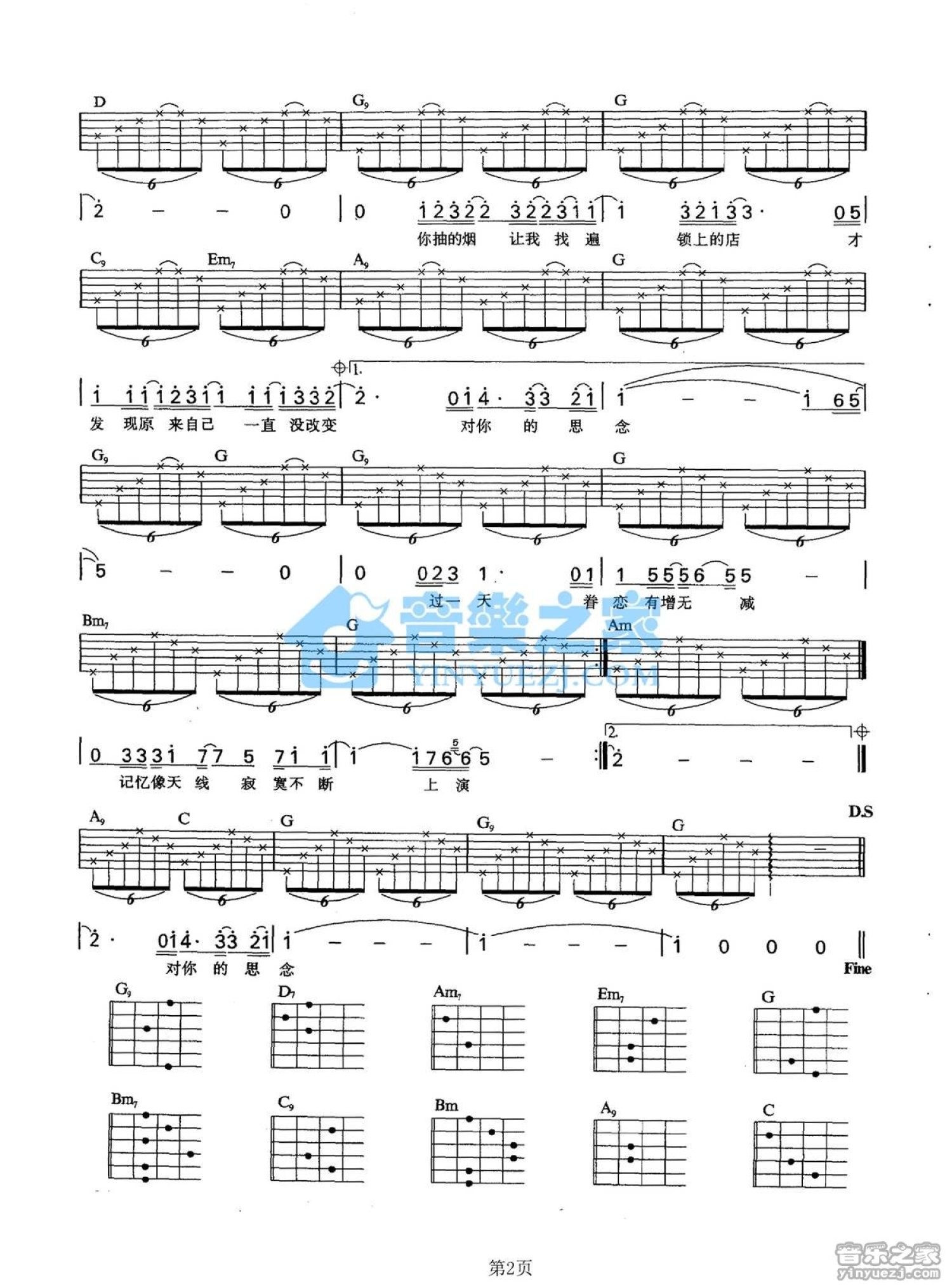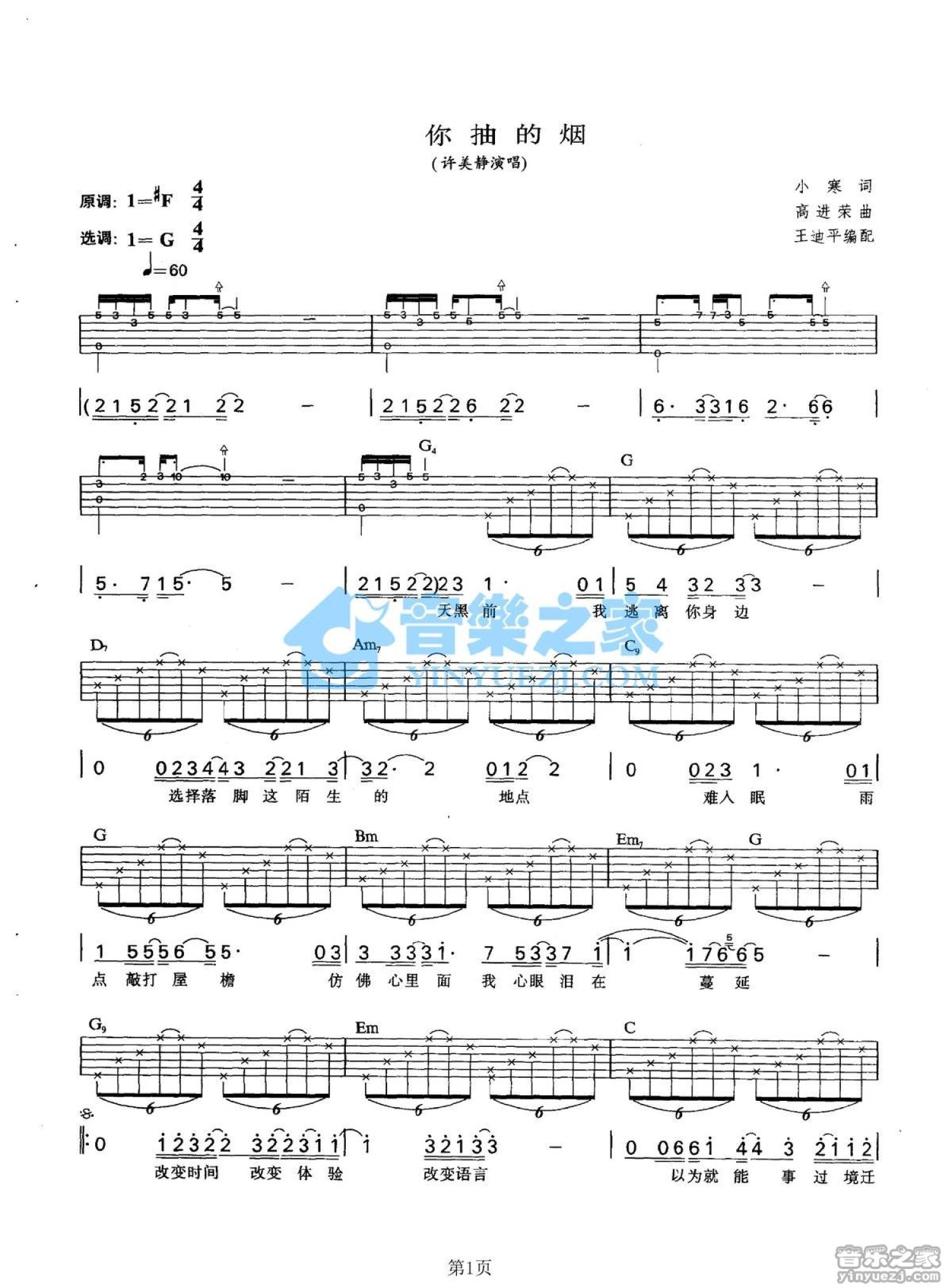 曲谱介绍: G调版许美静《你抽的烟》吉他弹唱六线谱