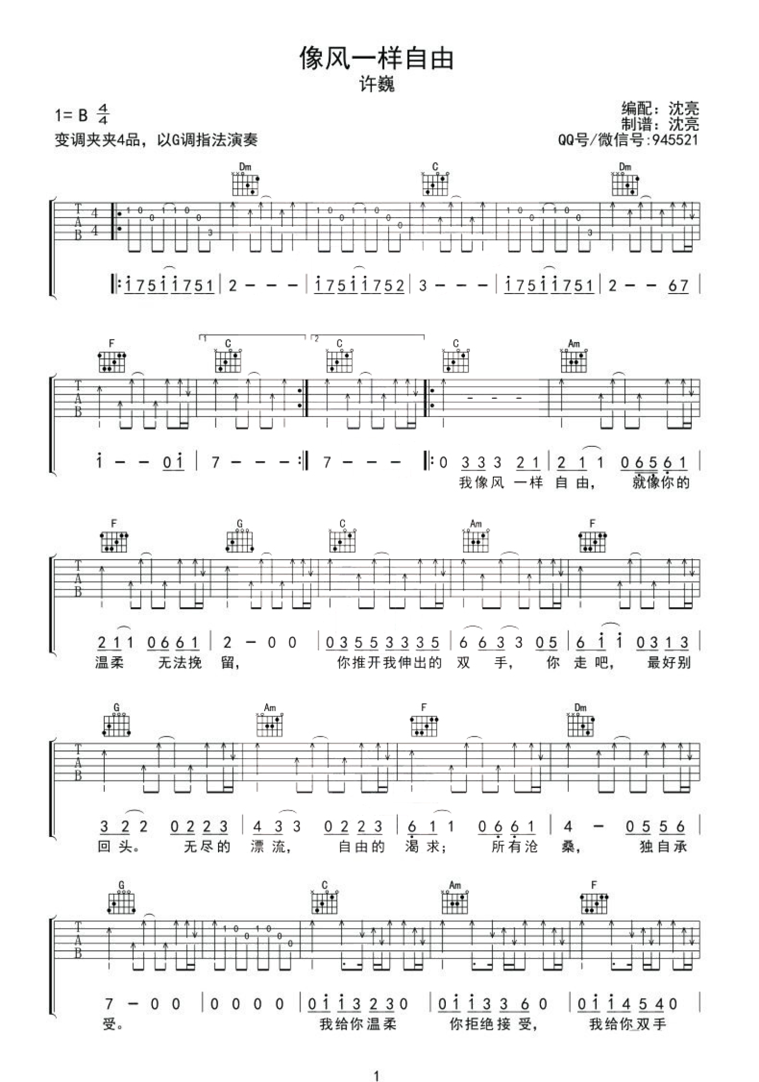 曲谱介绍: G调版许巍《像风一样自由》吉他弹唱六线谱