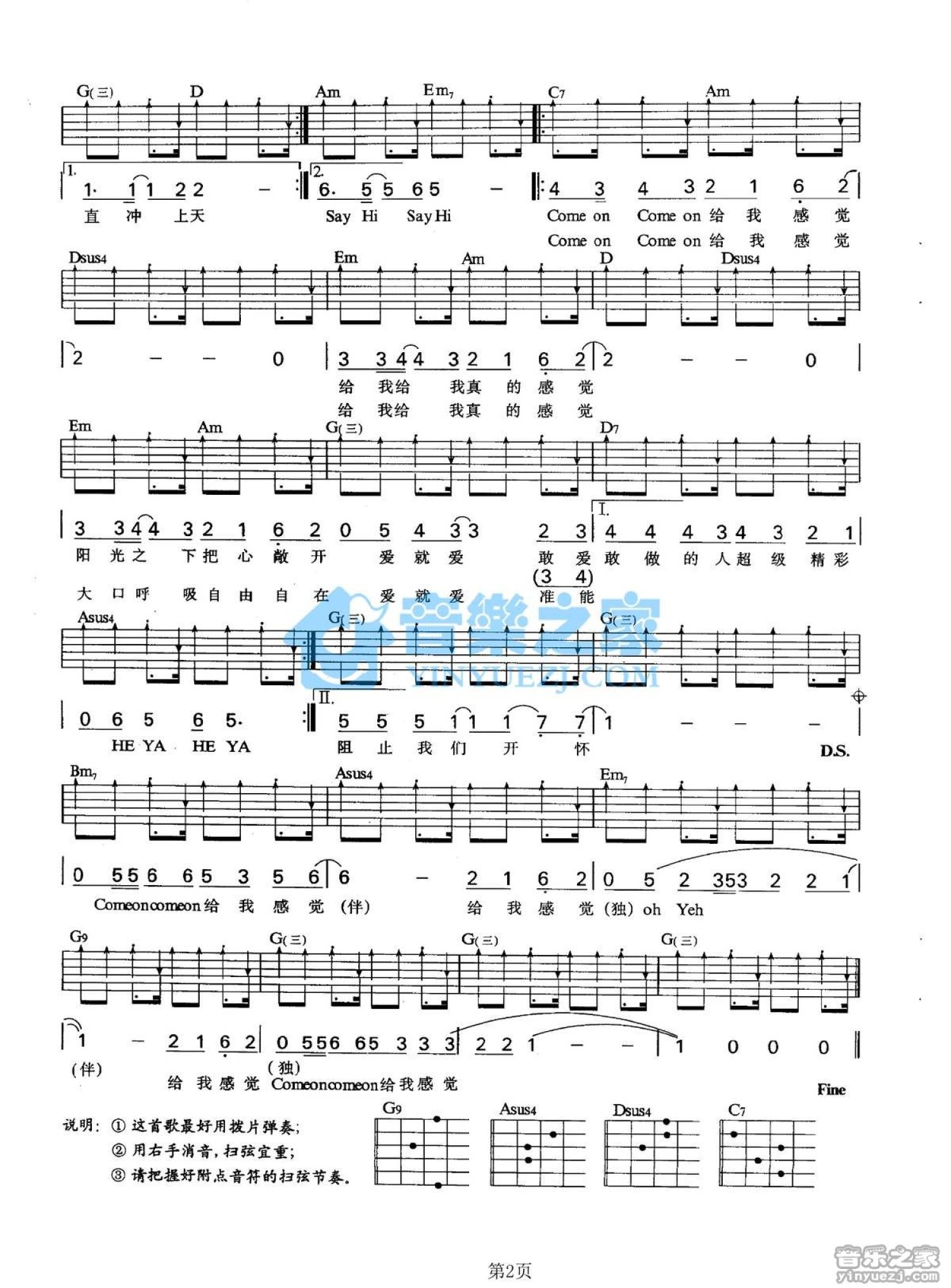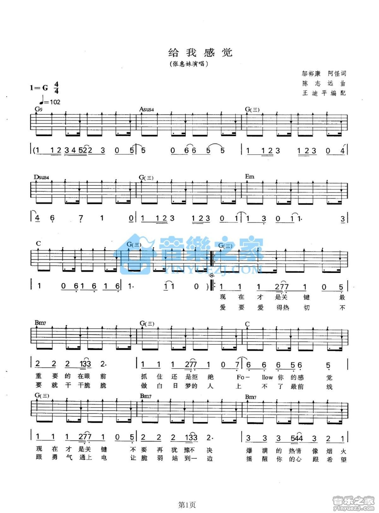 曲谱介绍: G调版张惠妹《给我感觉》吉他弹唱六线谱