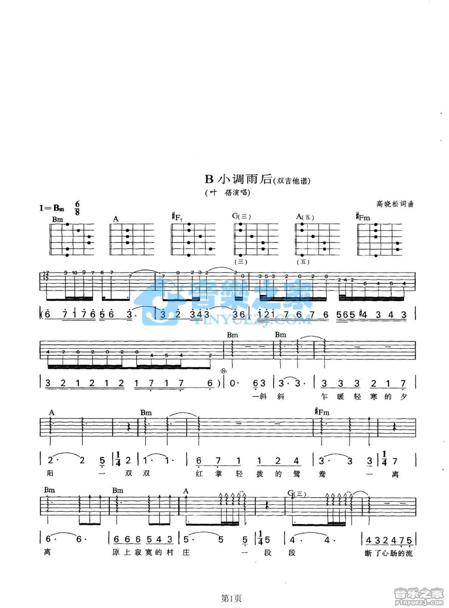 曲谱介绍: Bm调《B小调雨后》吉他弹唱六线谱