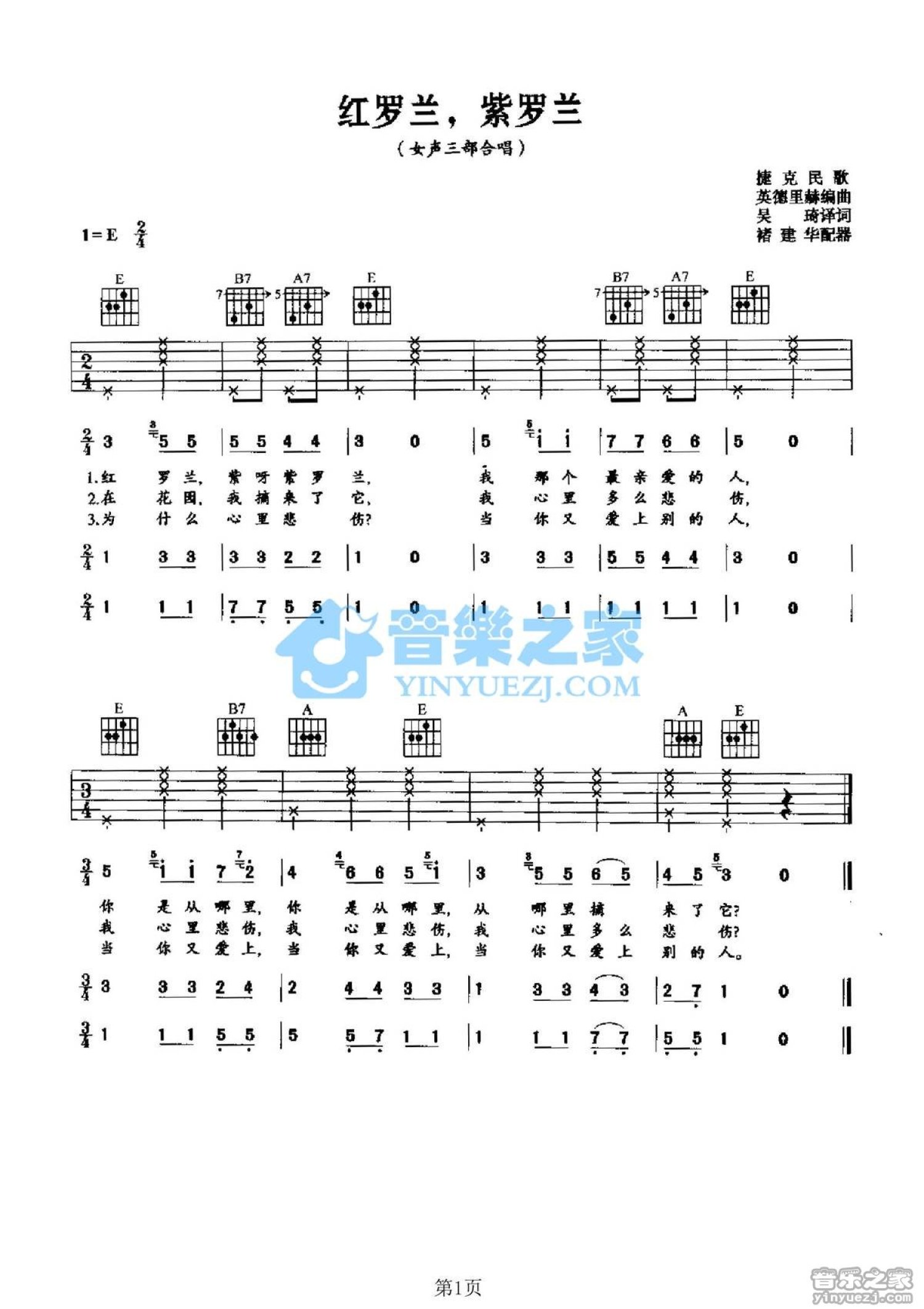 红罗兰紫罗兰吉他谱 - 捷克民歌 - E调吉他弹唱谱