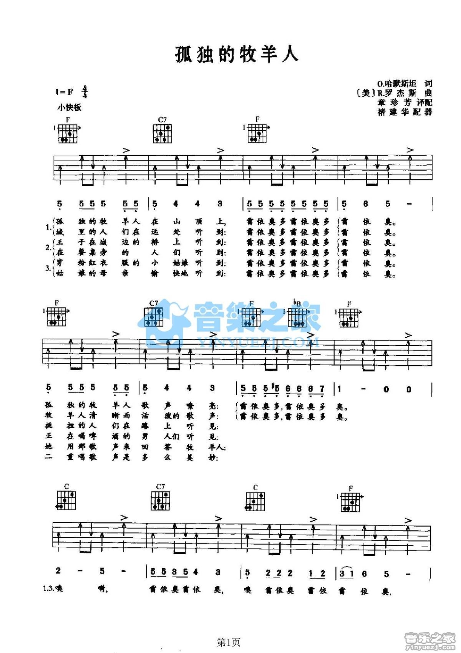 曲谱介绍: F调版 美国电影音乐之声插曲《孤独的牧羊人》吉他弹唱六线谱