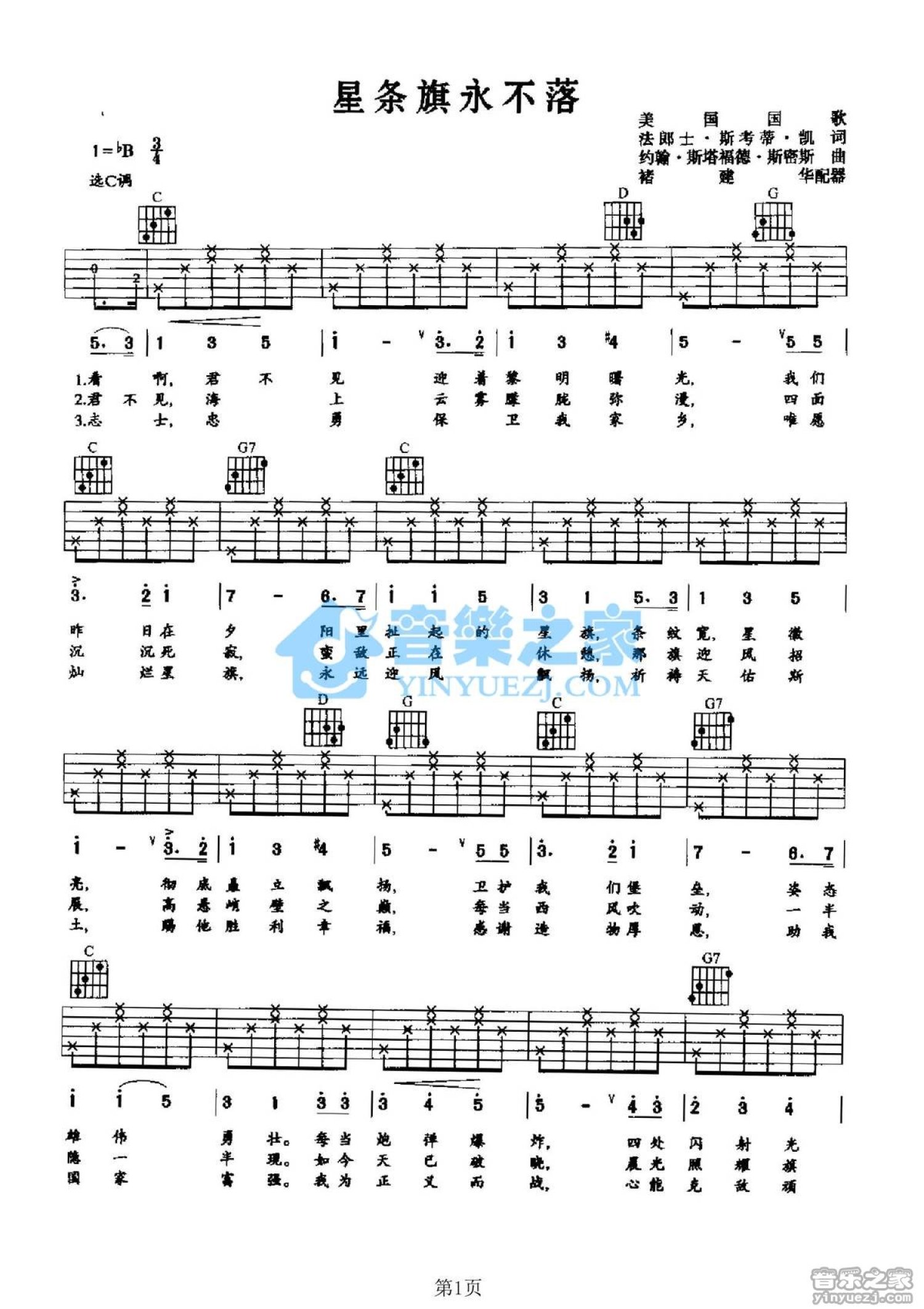 曲谱介绍: C调版美国国歌《星条旗永不落》吉他弹唱六线谱