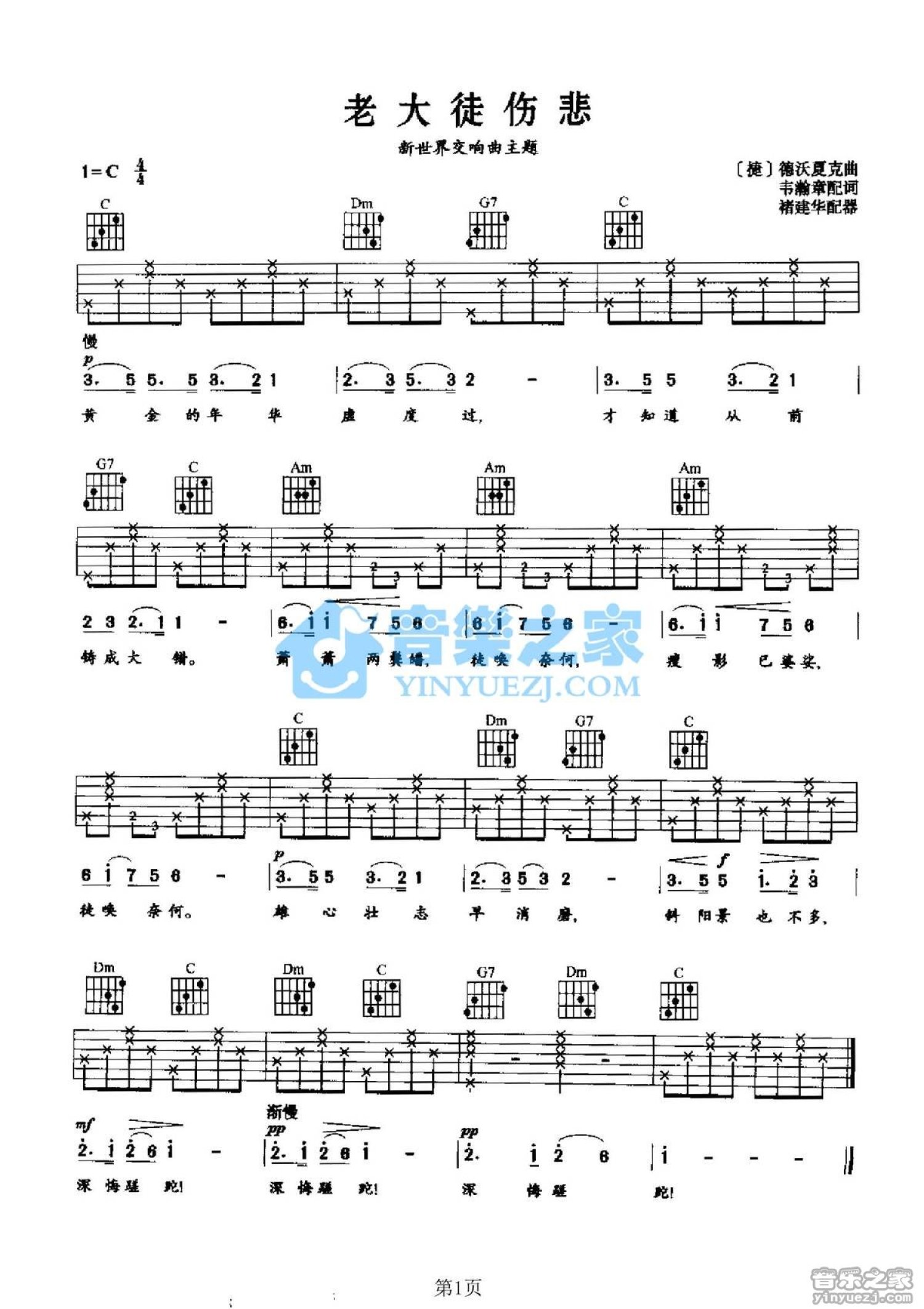 老大徒伤悲吉他谱 - 新世界交响曲主题 - G调吉他弹唱谱
