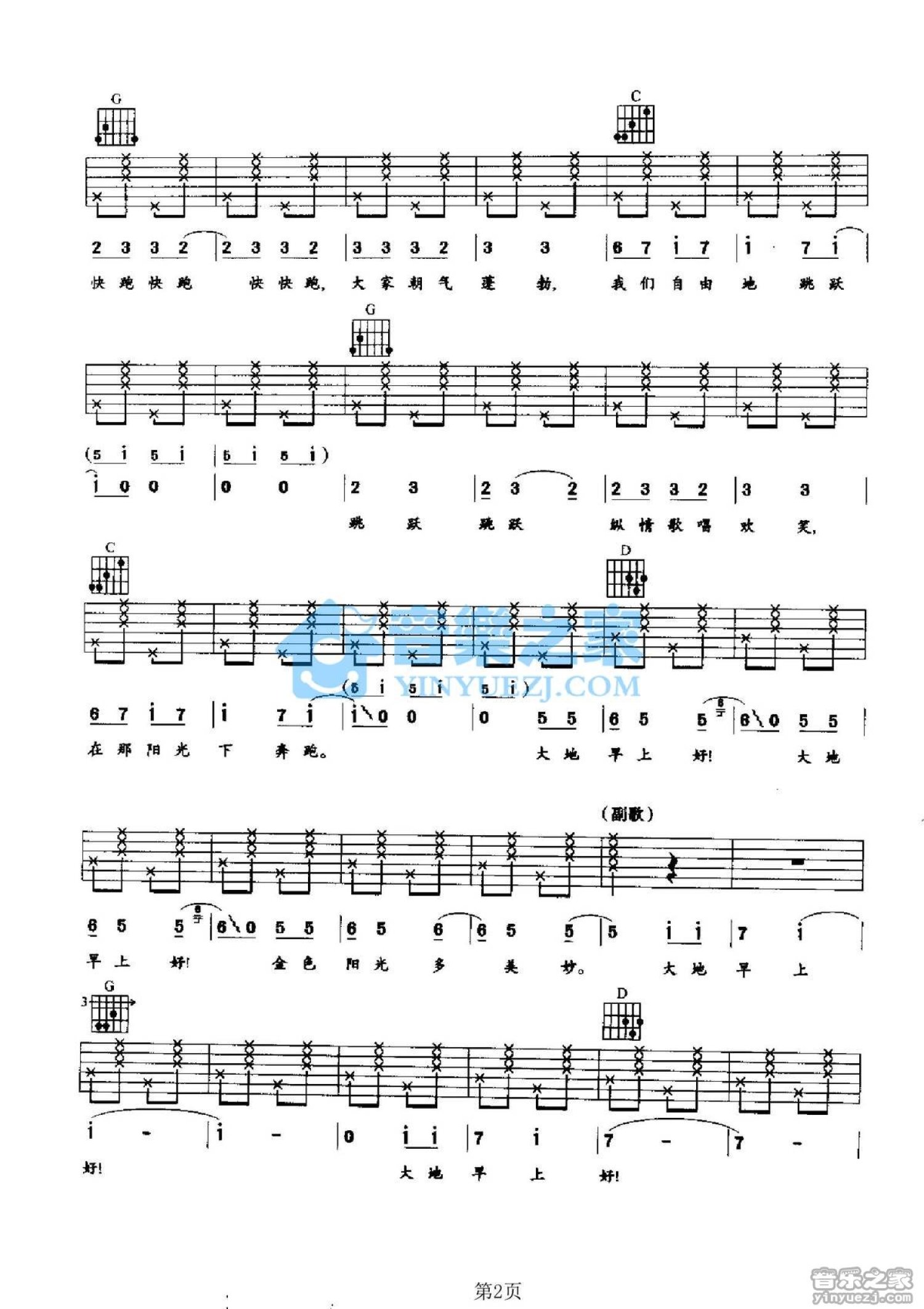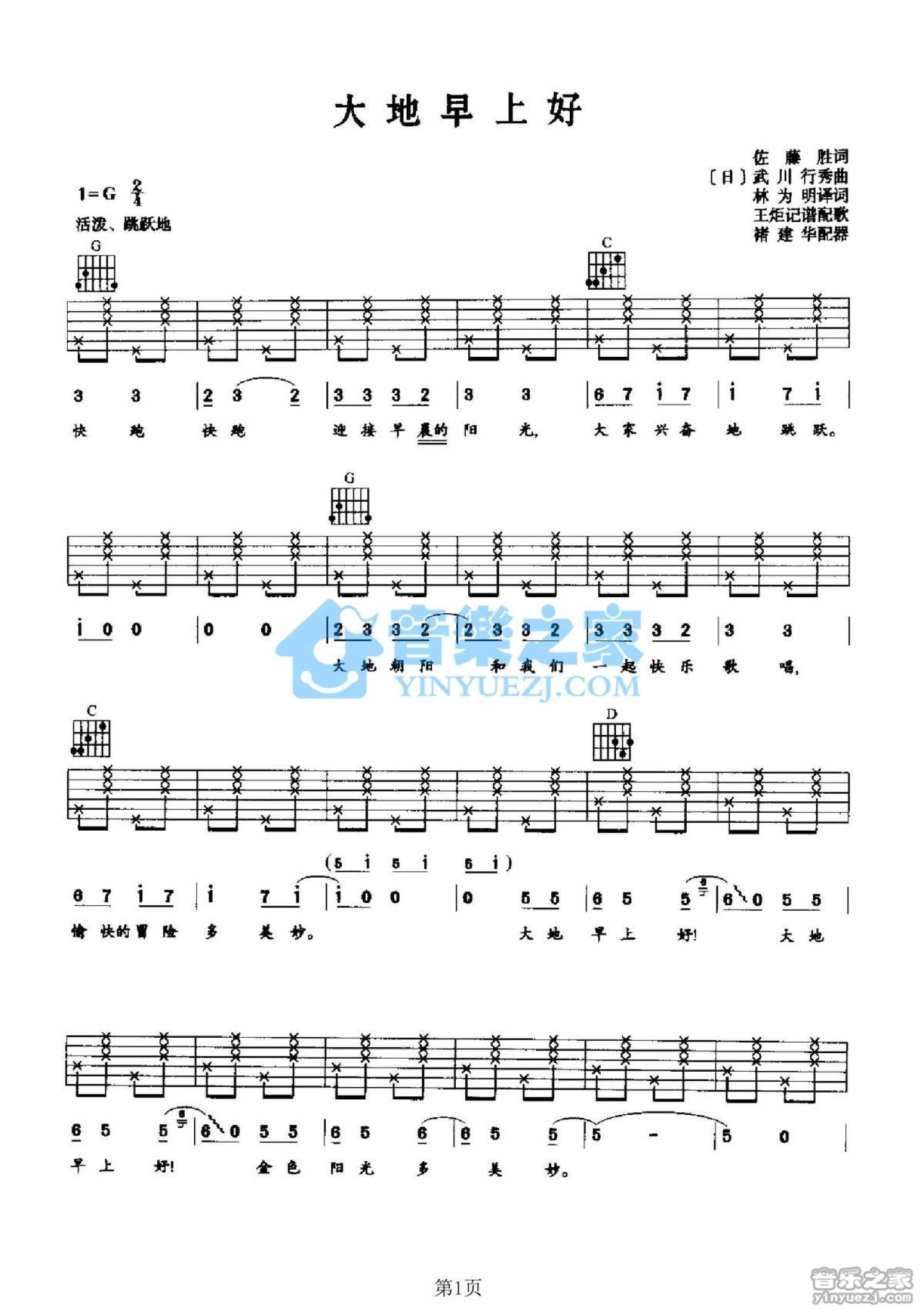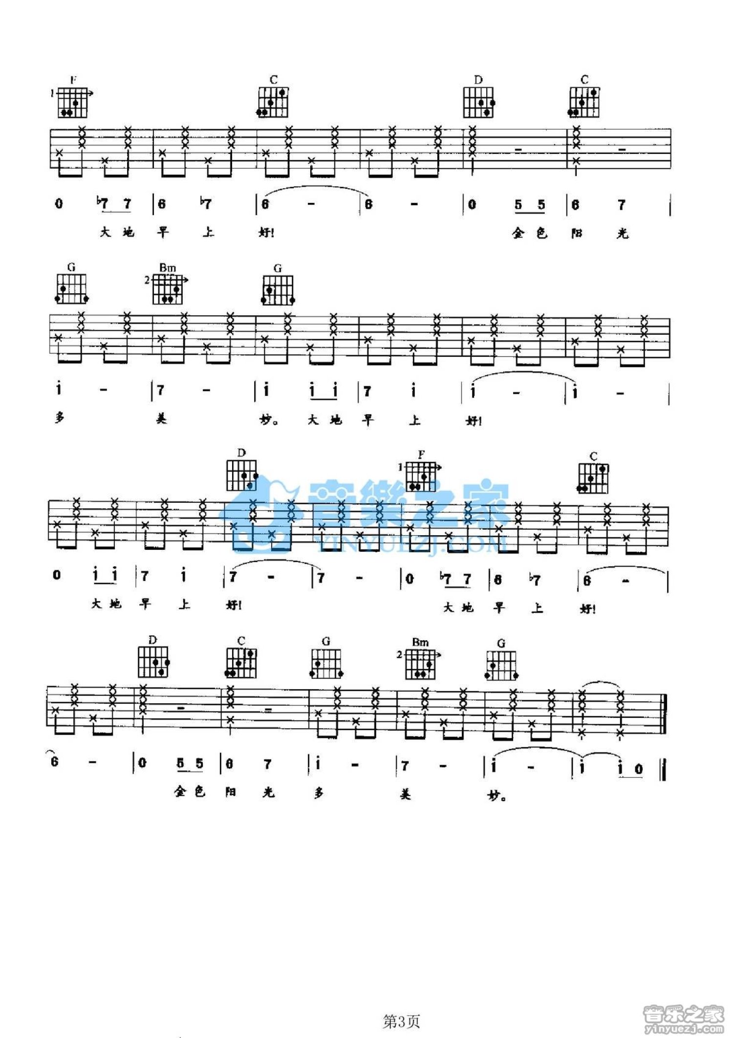 曲谱介绍: G调版儿歌《大地早上好》吉他弹唱六线谱