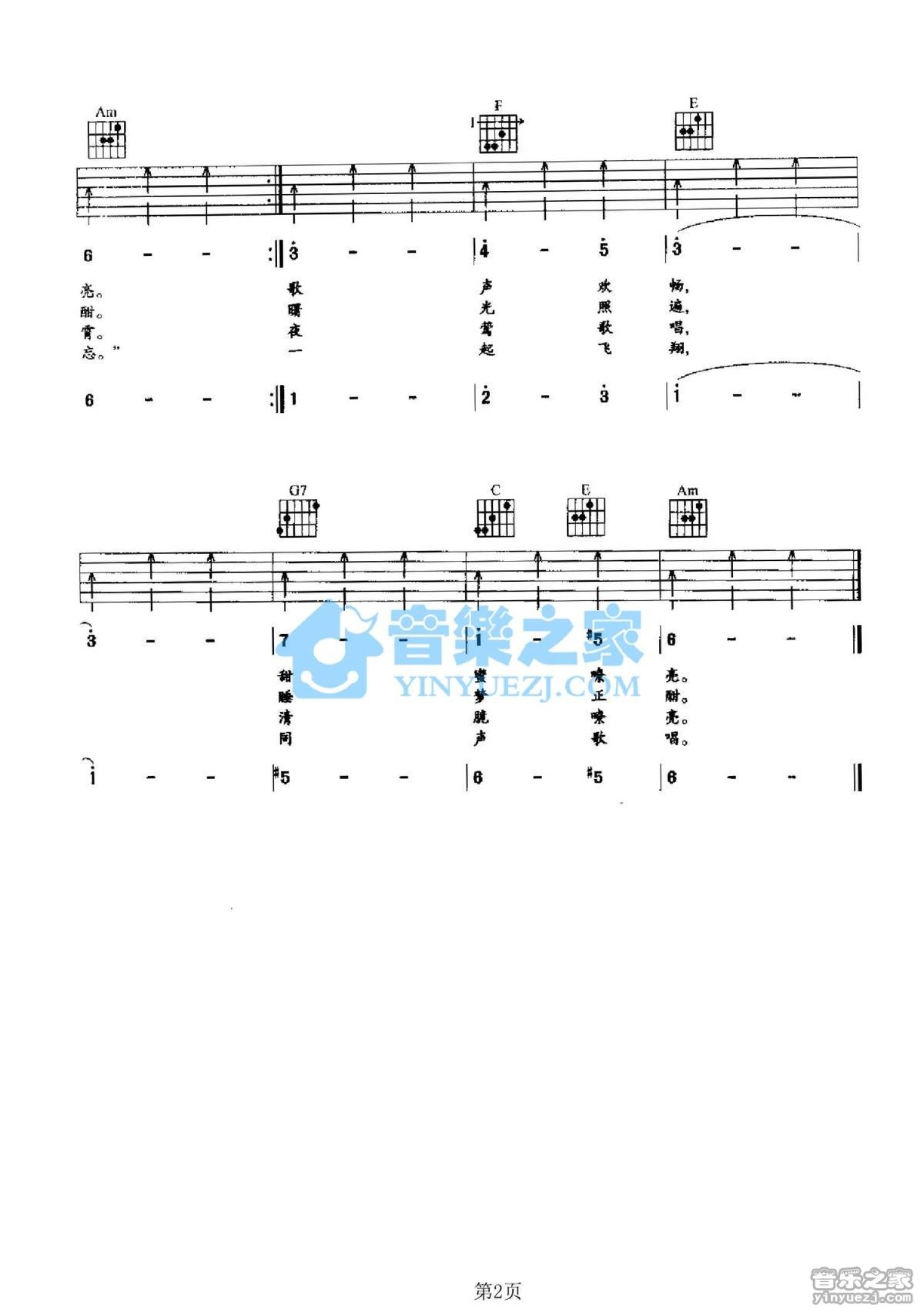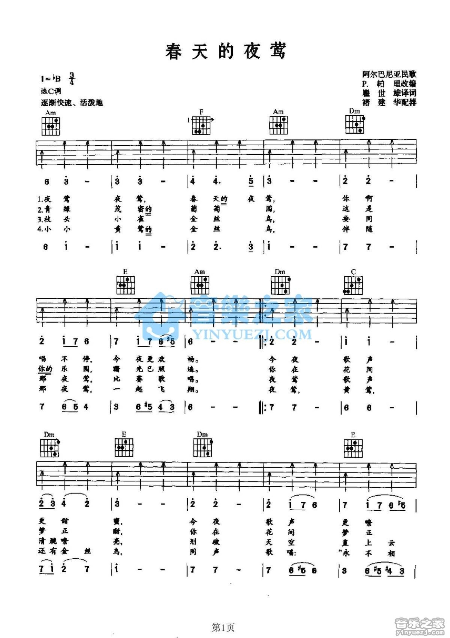 曲谱介绍: C调版阿尔巴尼亚民歌《春天的夜莺》吉他弹唱六线谱
