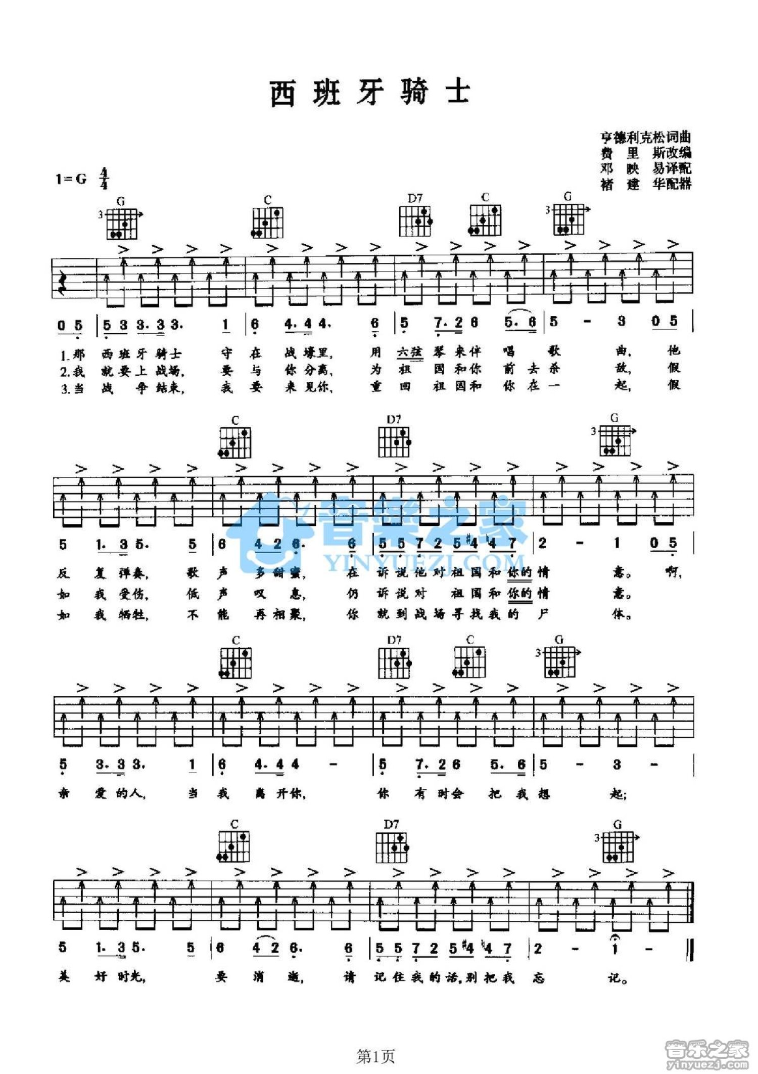 曲谱介绍: G调版苏格兰民歌《西班牙骑士》吉他弹唱六线谱