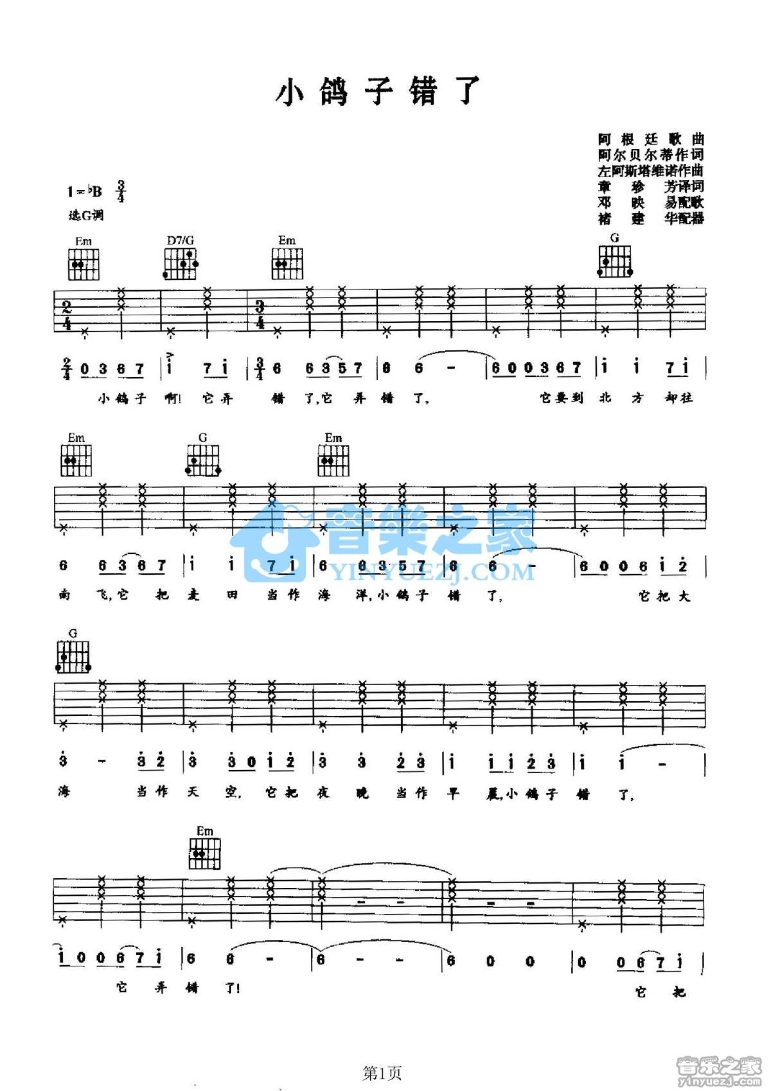 曲谱介绍: G调版阿根廷歌曲《小鸽子错了》吉他弹唱六线谱