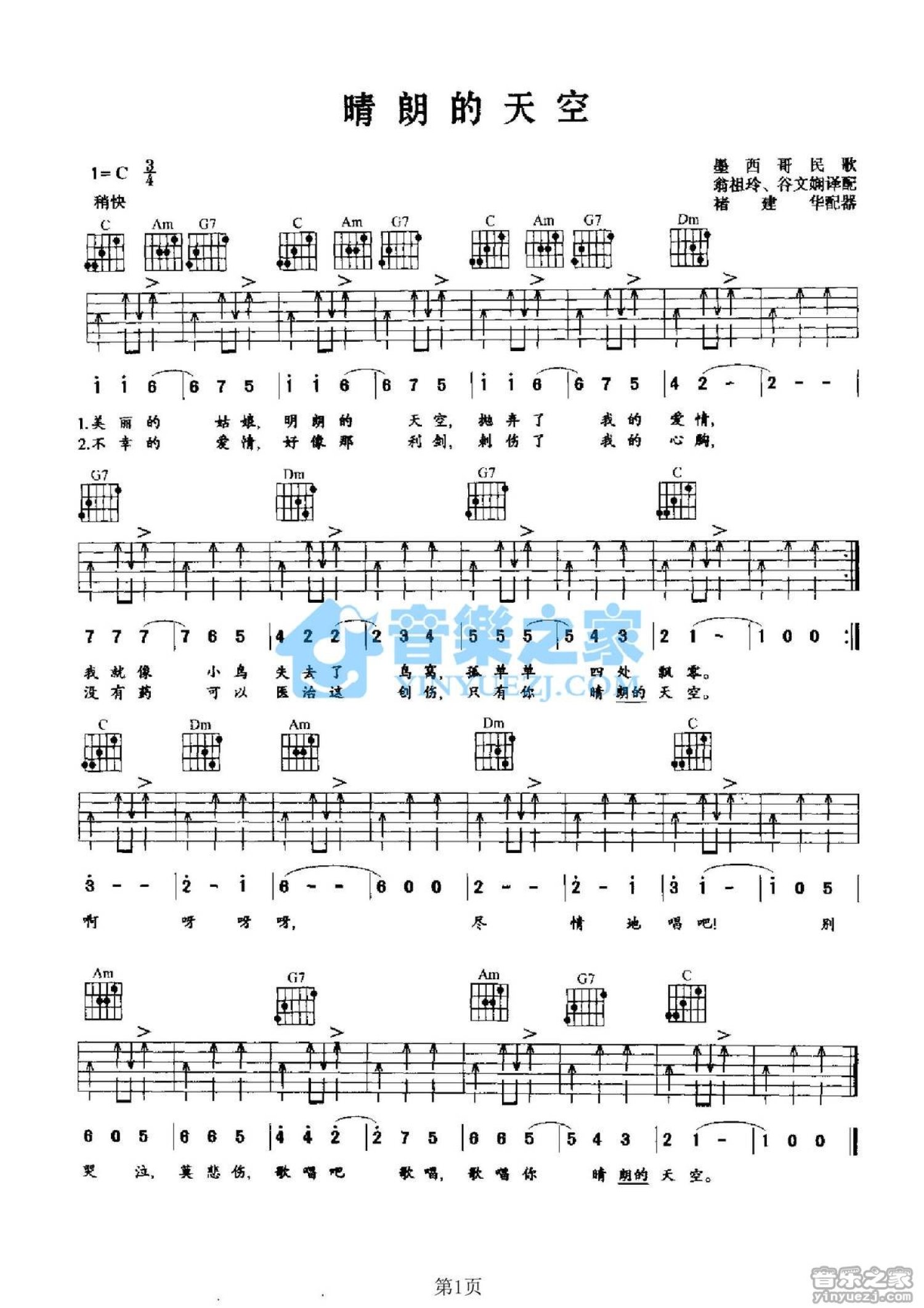 晴朗的天空吉他谱 - 墨西哥民歌 - C调吉他弹唱谱