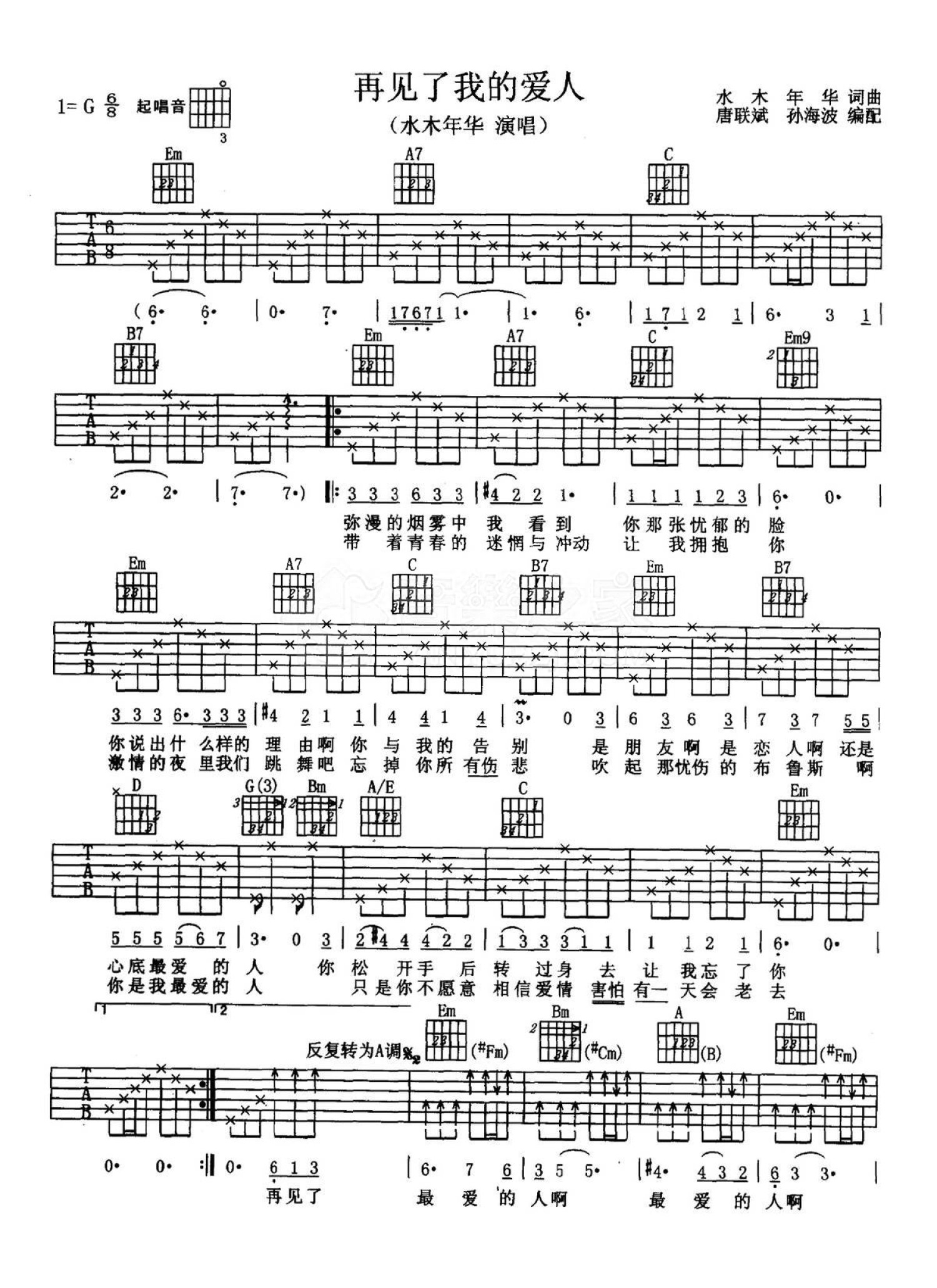 曲谱介绍: G调版《再见了我的爱人》吉他弹唱六线谱